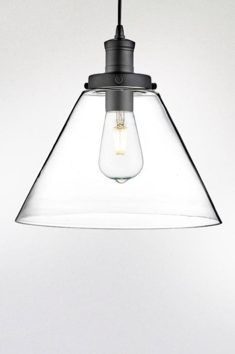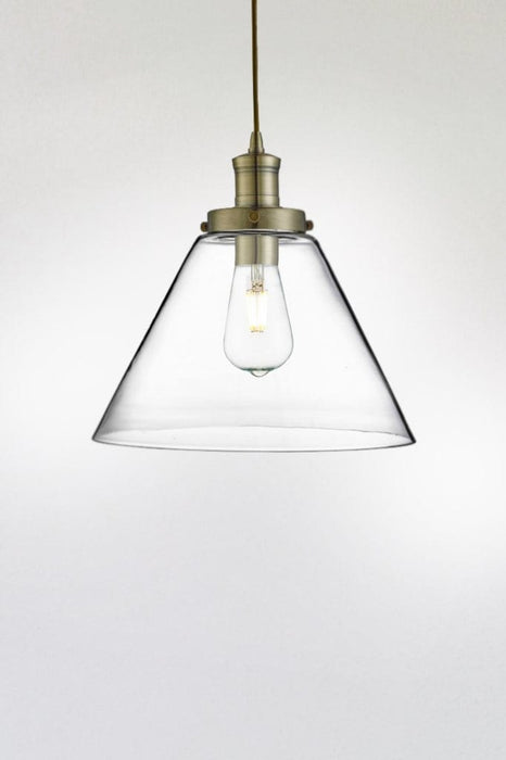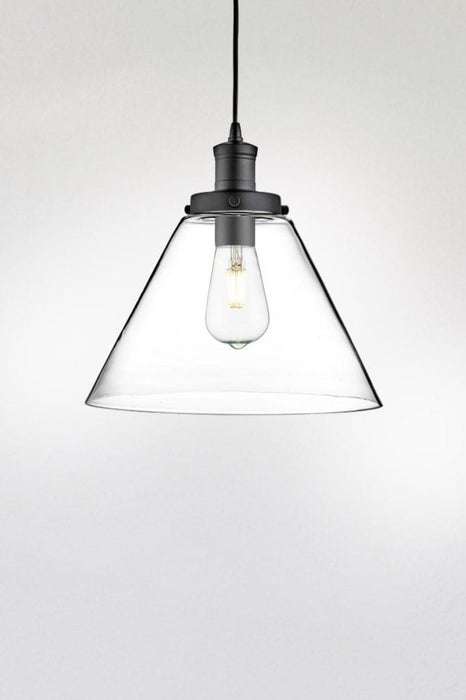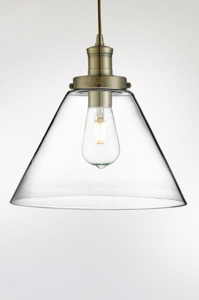 - This pendant light has a clear flared glass shade suspended by a fabric cord with metal fixtures in three finishes.