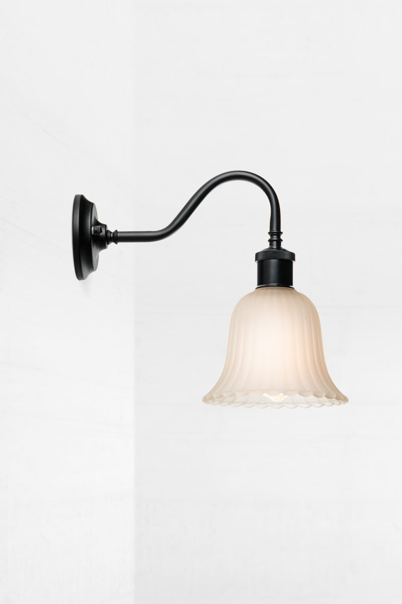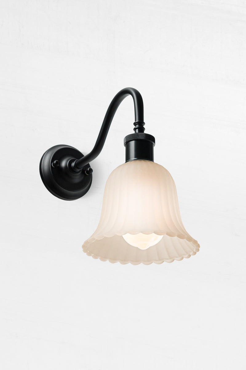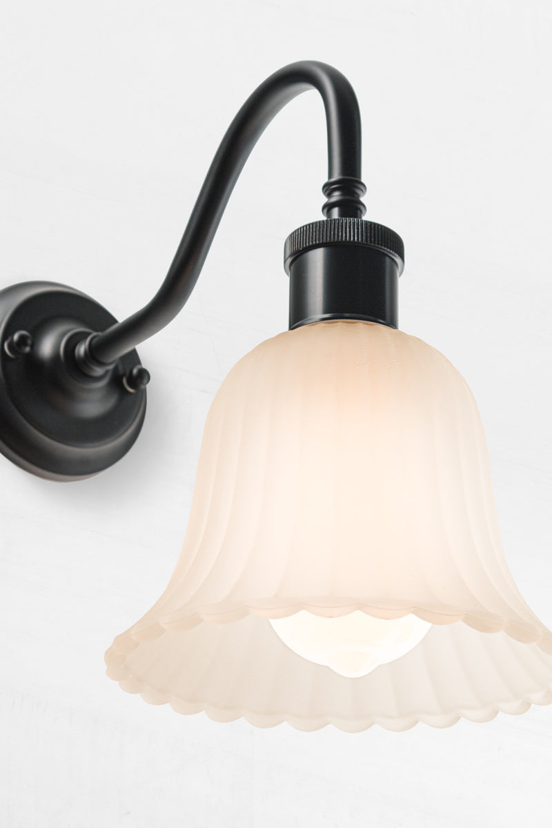 Characterised by graceful refinement and sophistication, the Lille Glass Gooseneck Wall Light brings understated finesse to any indoor space. Boasting a weighty frosted bell shaped glass shade with a intricate scalloped edge for a distinctive touch of style. Affixed on a slender steel gooseneck wall sconce, the peculiar build of this wall light will make it a noteworthy feature of your space.
