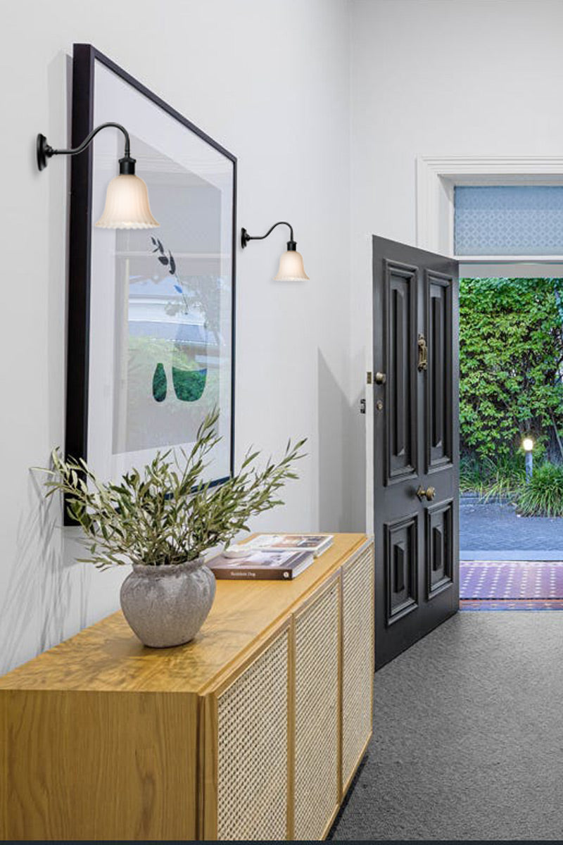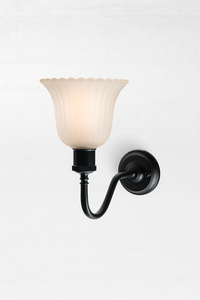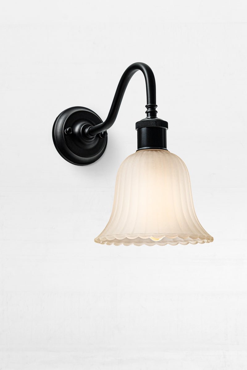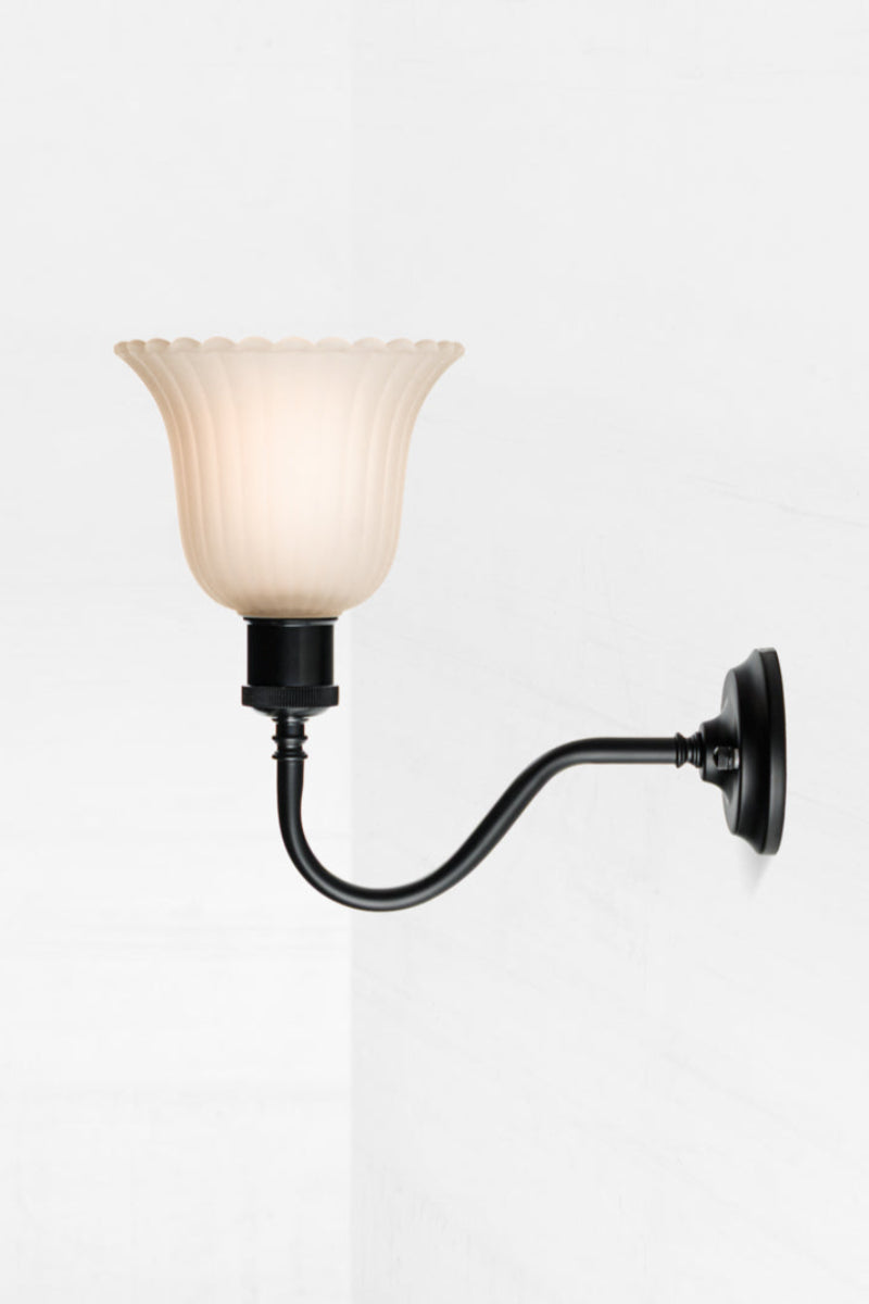 Characterised by graceful refinement and sophistication, the Lille Glass Gooseneck Wall Light brings understated finesse to any indoor space. Boasting a weighty frosted bell shaped glass shade with a intricate scalloped edge for a distinctive touch of style. Affixed on a slender steel gooseneck wall sconce, the peculiar build of this wall light will make it a noteworthy feature of your space.