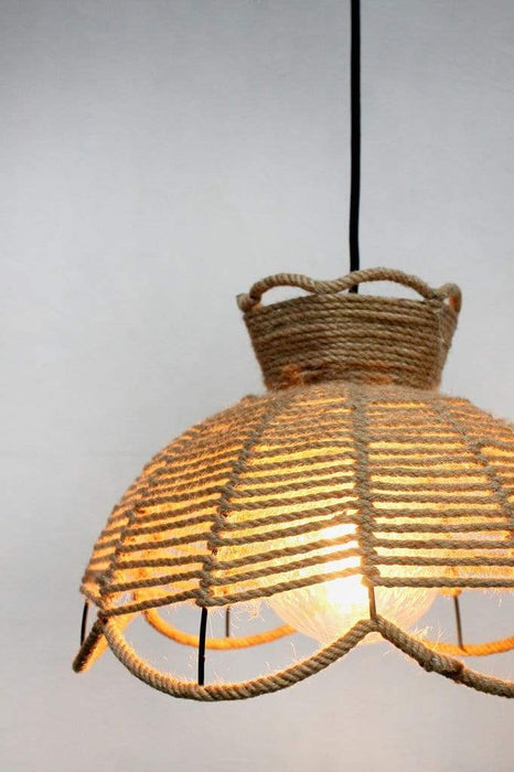 - The shades are made from linen rope that is woven and threaded around a black metal frame.