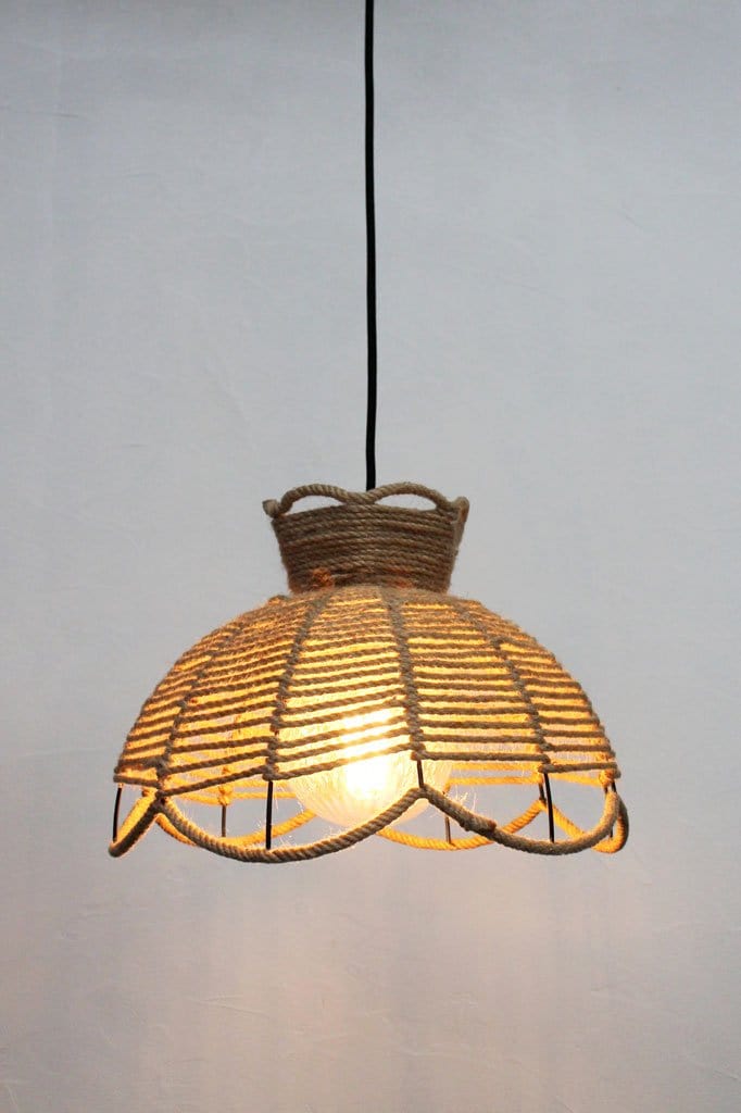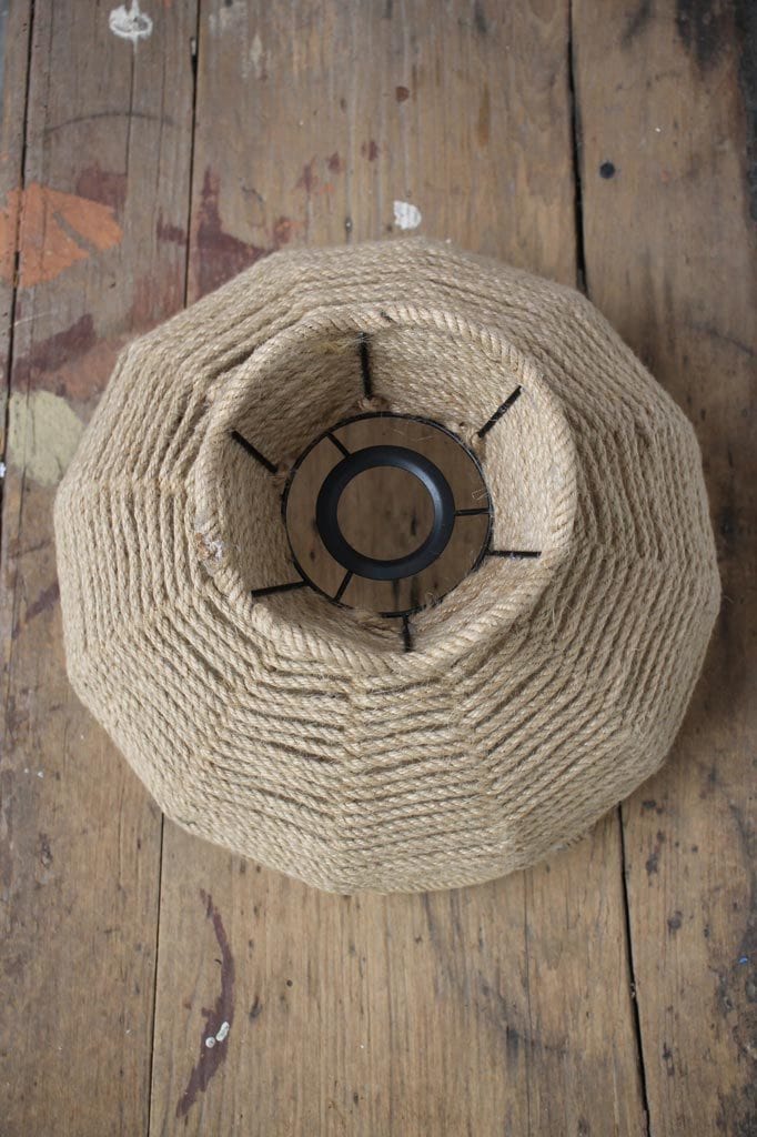 - The shades are made from linen rope that is woven and threaded around a black metal frame.