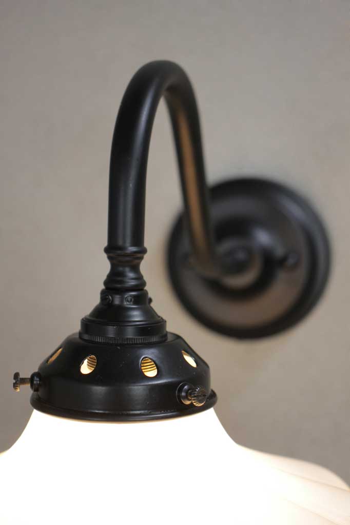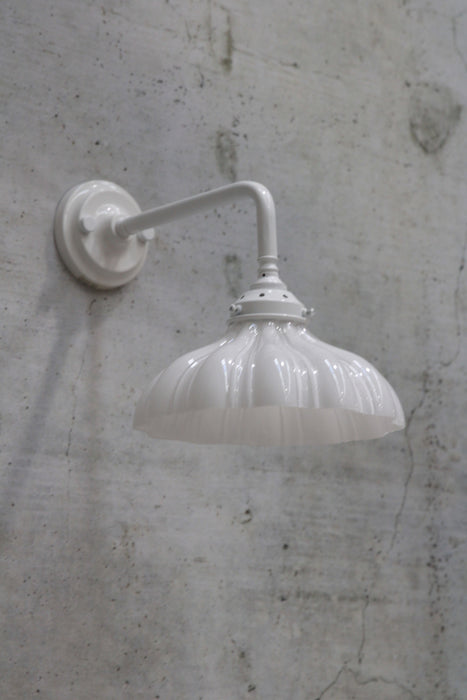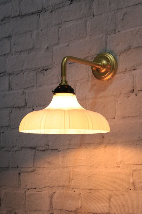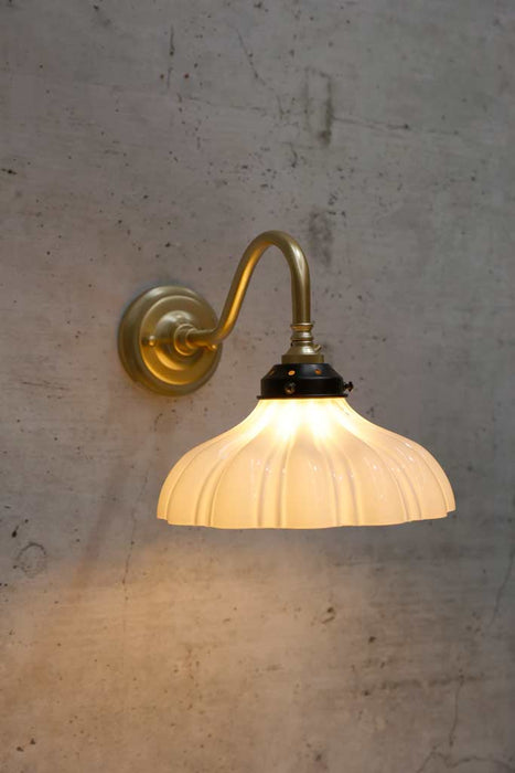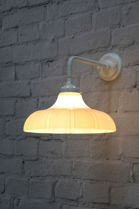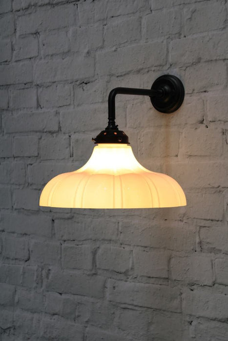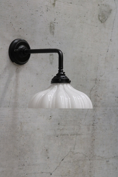 The Mayflower Glass Wall Light seamlessly blends industrial appeal with subtle sophistication. Mounted from a gooseneck or 90 degree wall sconce, the opal glass shade brings a warm elegance with its shapely ornate design. Its wall sconce is made from steel and comes in a selection of modern and vintage finishes. It is ideal for spots where a pendant light or floor lamp would be too obtrusive and makes a graceful addition to hallways and restaurants.
