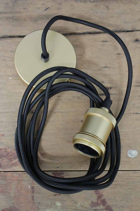 - Gold brass option features a gold brass metal lampholder, shade ring and a ceiling rose with a black braided cord.