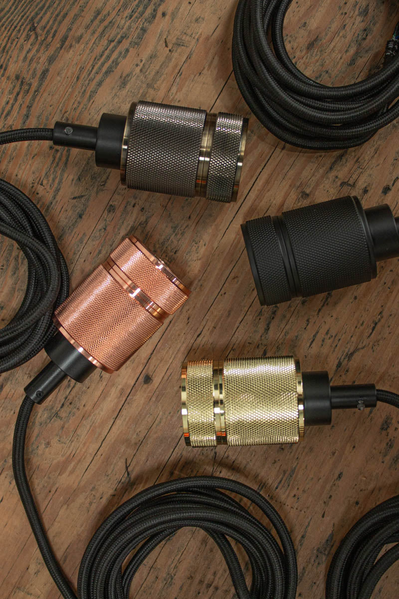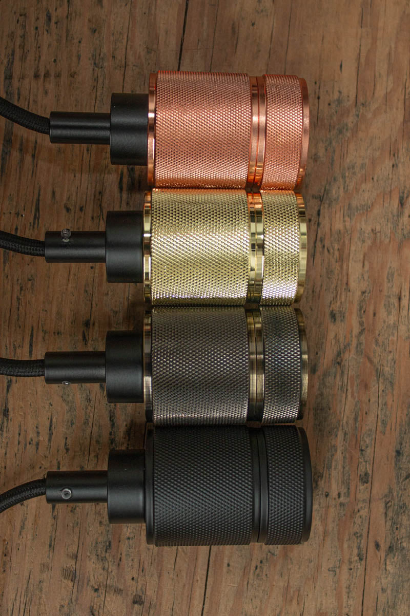 These Knurled Metal Pendant Light Cords encapsulate modern industrial styling with their chic knurled finish. The metal lamp holders come in three popular finishes to suit a range of interiors. They have a matt black ceiling rose and are complete with a black braided cord. They look great with either just a bare bulb or they can add that finishing touch to a corresponding E27 shade. These metal lamp holder pendant cords would suit a range of commercial or residential lighting applications.