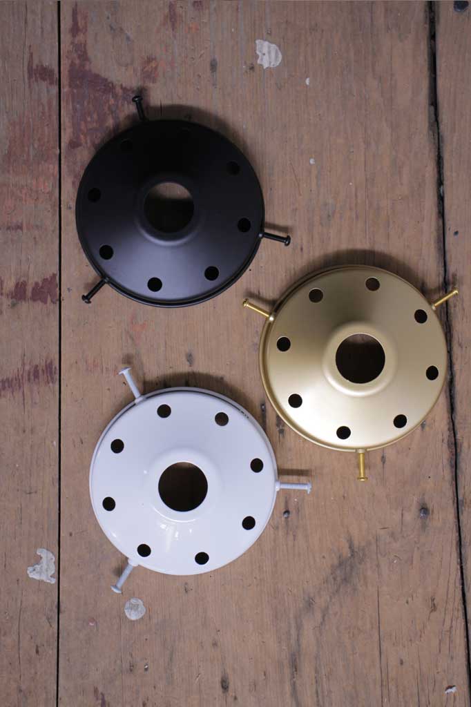 These metal lamp galleries are made of pressed brass or steel. They are available in seven popular finishes and are ideal for attaching a shade to a pendant light cord as well as to a wall light fixture.