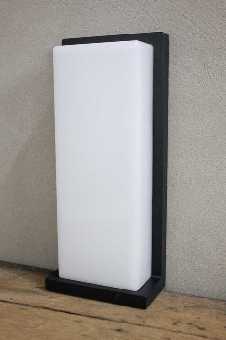 • It features a black metal base fitted with a polycarbonate shade with an opal finish.