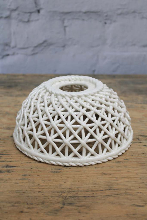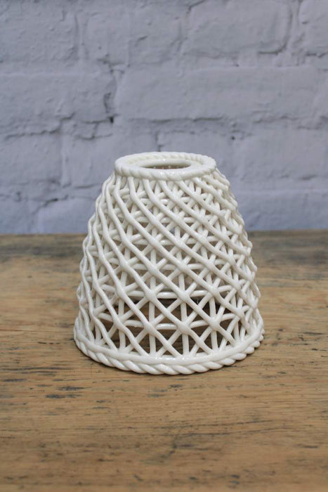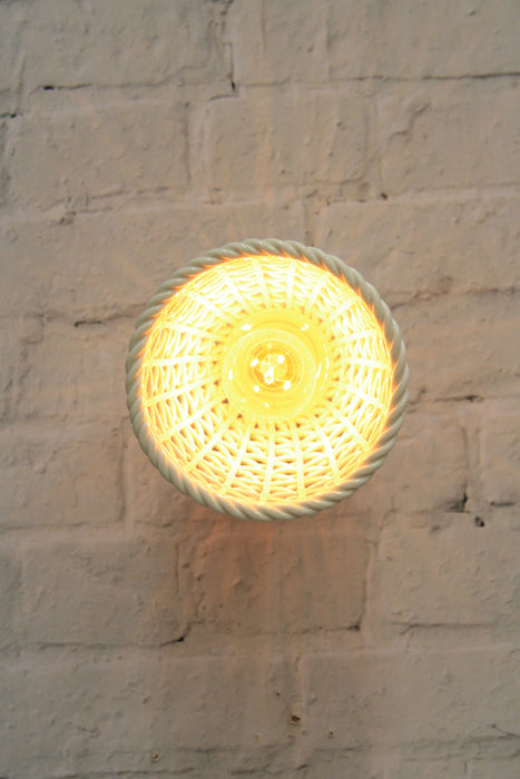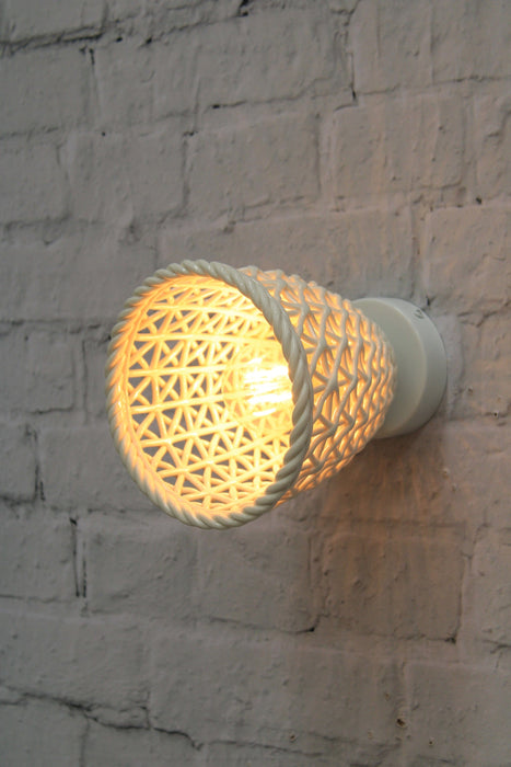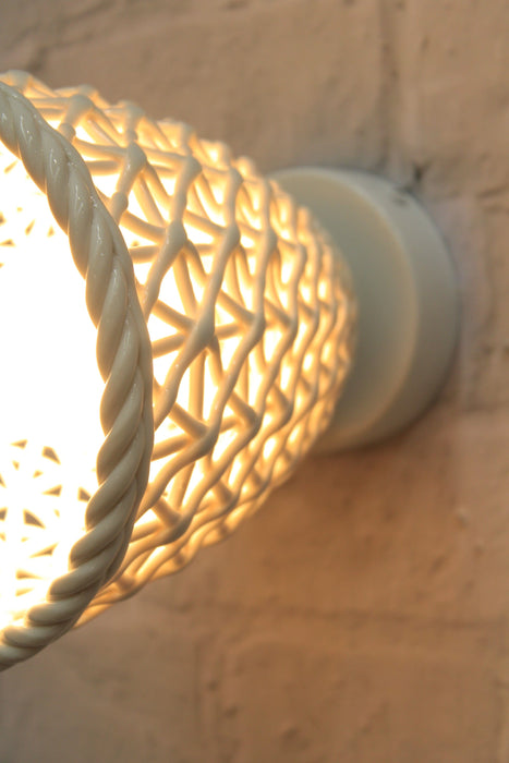 This Ceramic Wall Lamp features a delicate glazed ceramic shade with a labyrinthine-like detailing. It is an exquisite fixture that embraces both a vintage and bohemian aesthetic. The openings in the shade enable light to pass through, illuminating your space with an incandescent glow. Paired with either a black or white wall mount, affix this wall light within your living room, by your bedside, or within quaint cafes or restaurant booths for a beautiful lighting statement.
