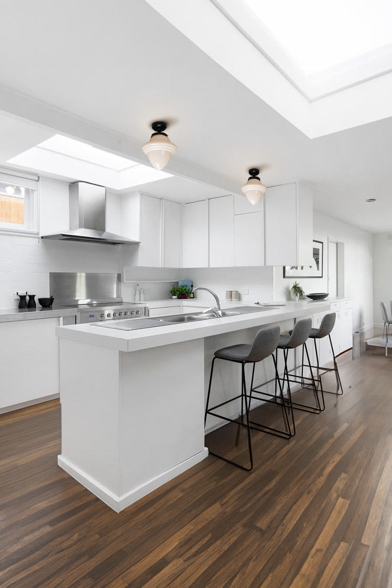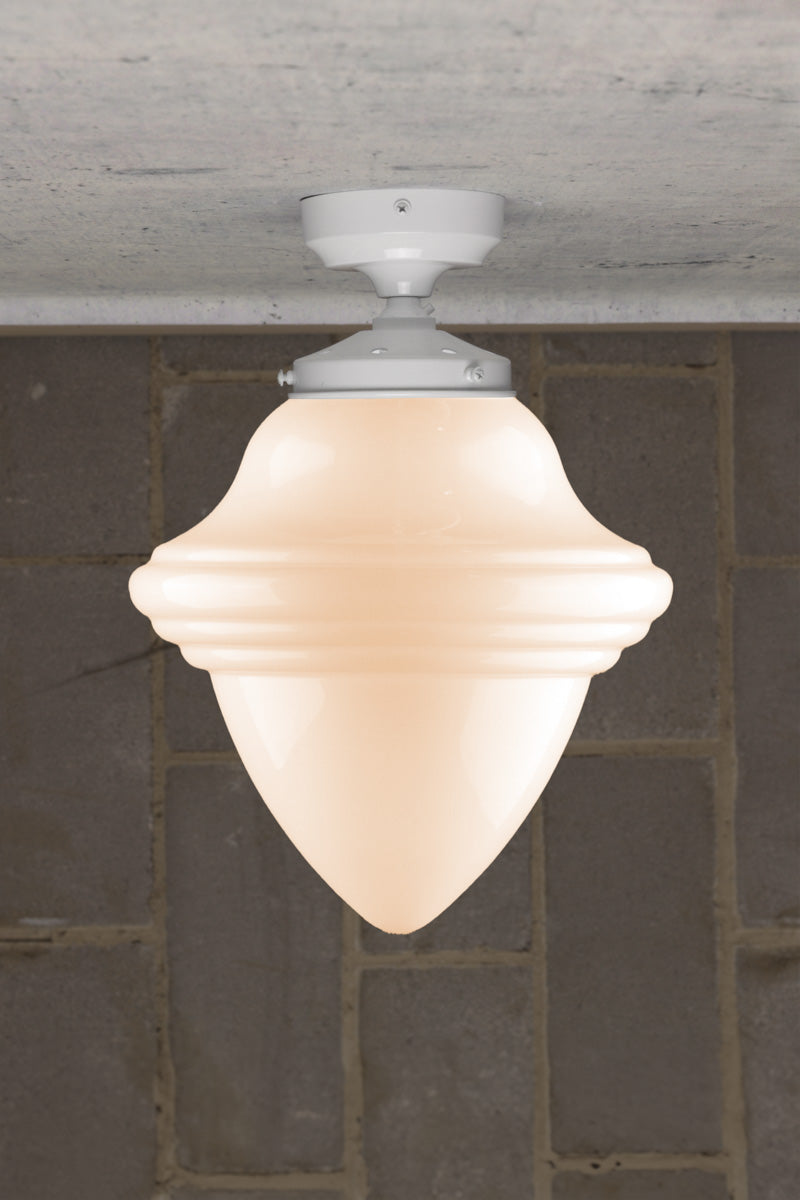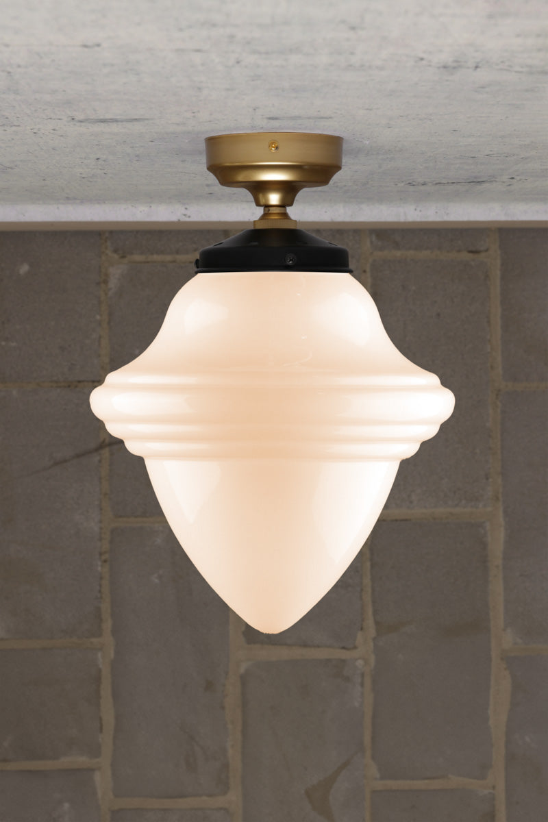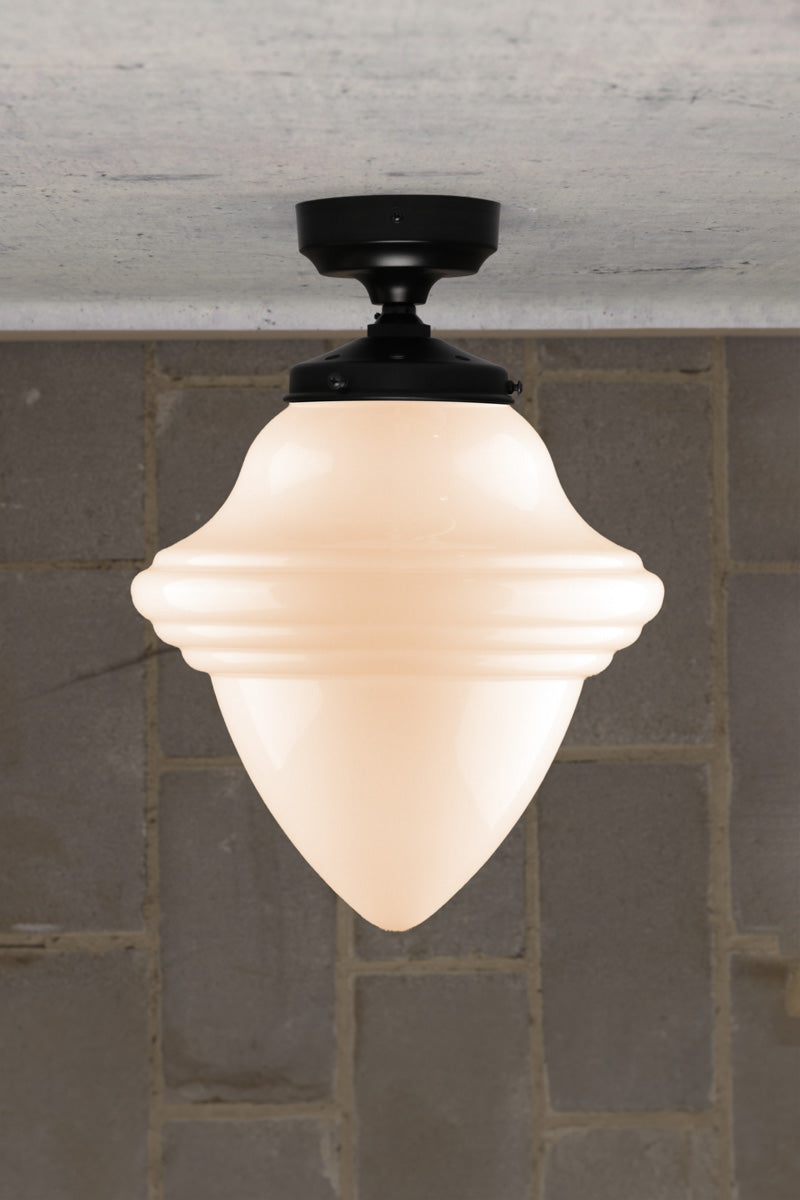 These Minnesota Deco Flush Mount Light possess a timeless design popularised during the 1920s. This reproduction preserves the classic illumination of libraries, schools, and courthouses of the era. Its unadorned lines bring sophistication to traditional and modern settings. Install this as a feature light in an entry foyer or as multiples in a lounge room. Available only at Fat Shack Vintage.