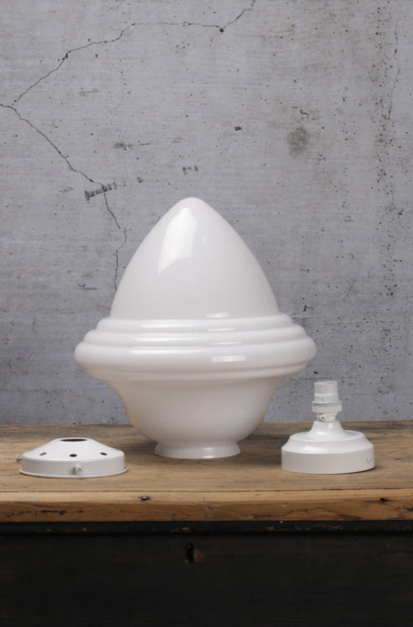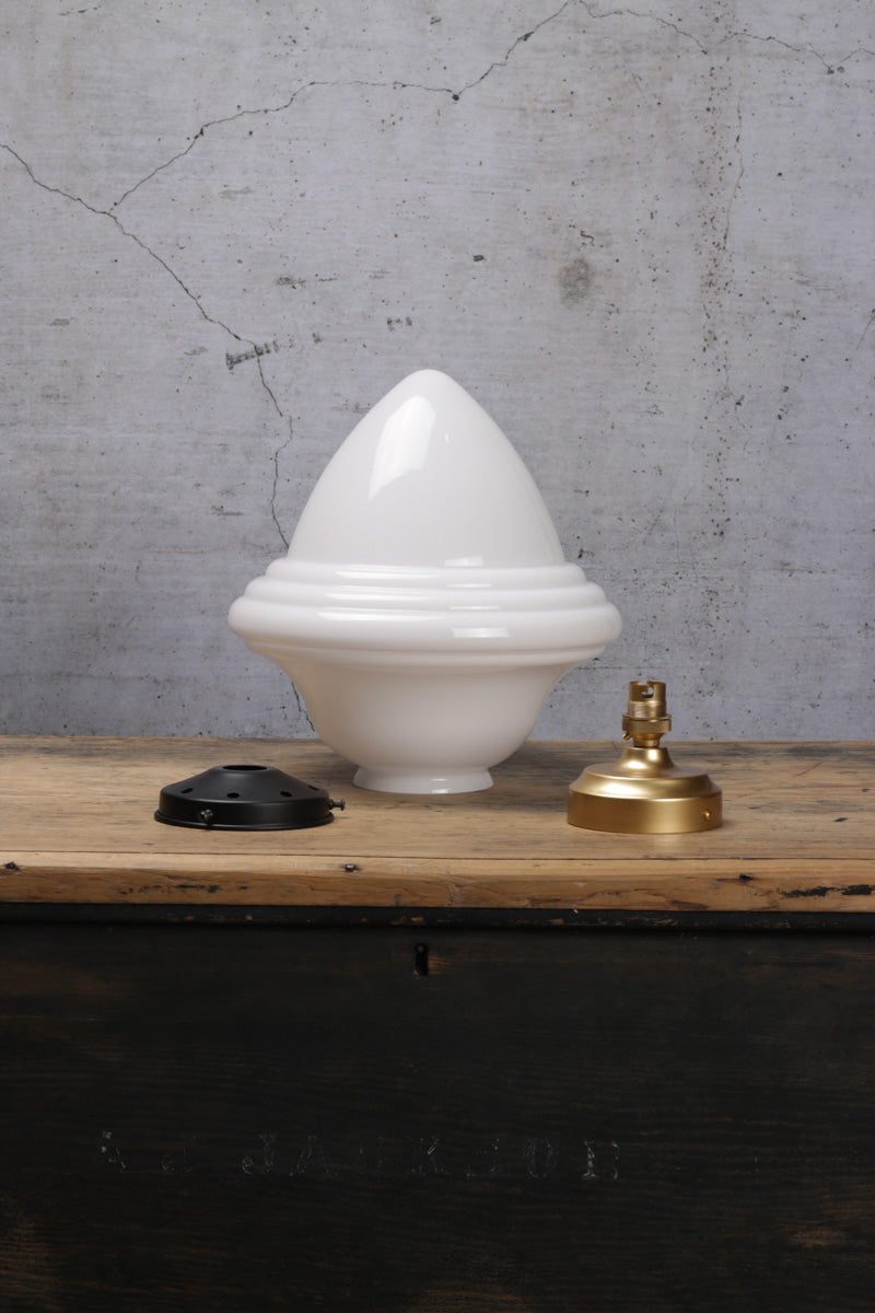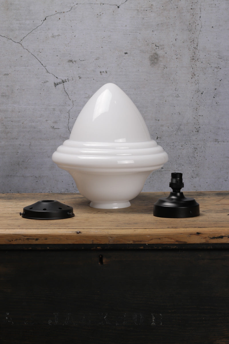 - Opal glass shade for diffused lighting. Features a tiered level design shaped in the middle of the shade.