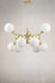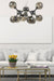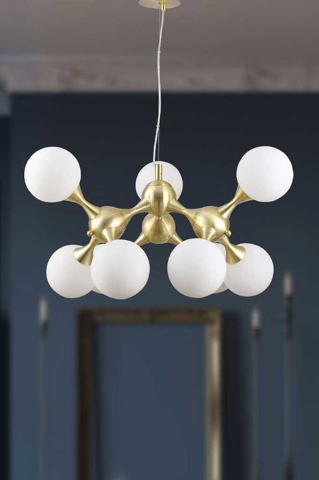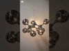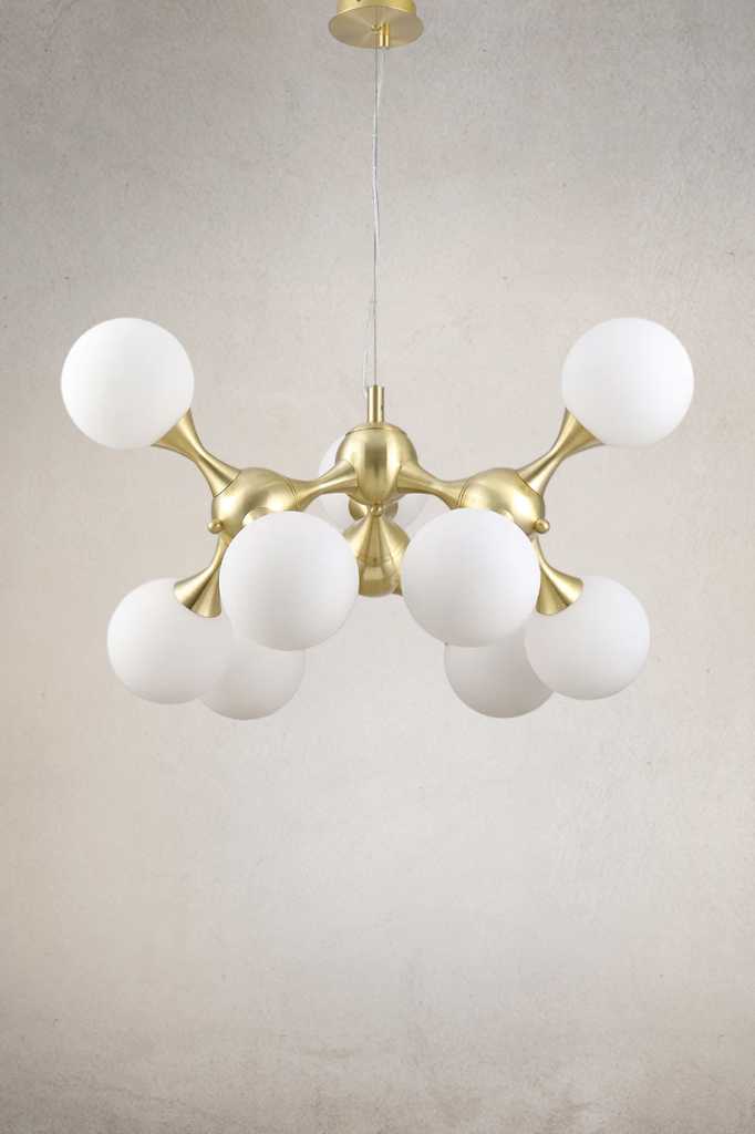 This contemporary sculptural light fitting has been influenced by the molecule chandeliers of the swinging sixties. The fixture comes in a chrome frame with nine smoked glass shades or a brass frame with nine opal matt glass shades, creating a uniquely fluid shape. This glass pendant light comes with small built in globes adding to it's effect. This avant-garde multi light pendant would make a bold statement in a modern setting. Place above a kitchen island bench in a white kitchen or above a table in a formal living area. In a commercial setting this light would suit a modern hotel reception area or contemporary art studio.