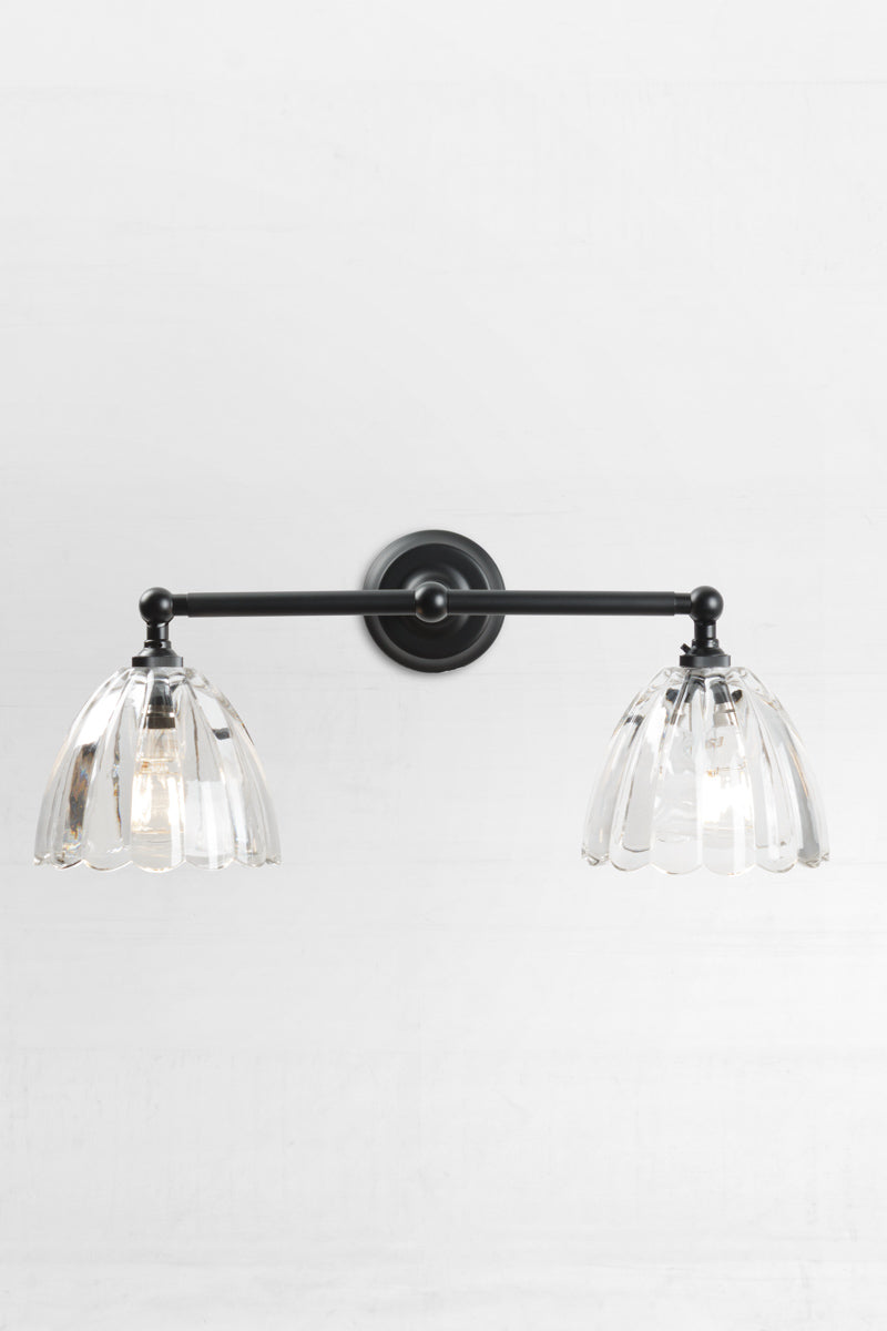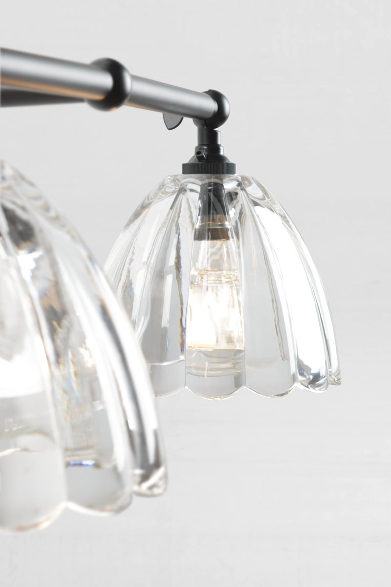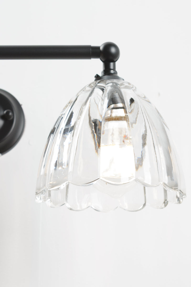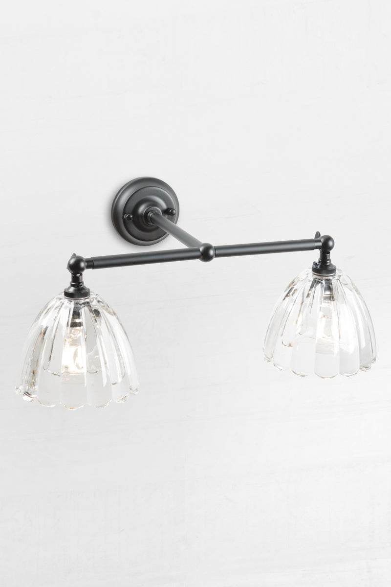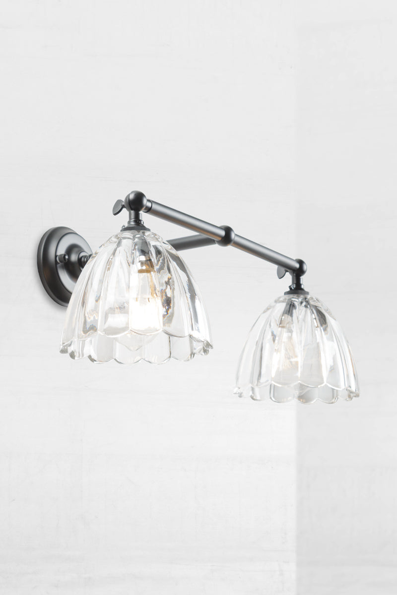 Discover elegance with the Monroe Glass Double Swivel Wall Light. It features two bell-shaped shades made of thick clear glass that reflects light for a crystalline effect when illuminated. The scalloped edge detailing adds a touch of refinement. Elevate the aesthetic of your interior with this beautiful and functional piece.