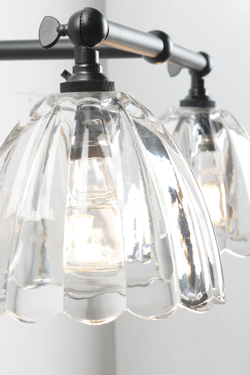 • This light comprises of a two bell shaped clear glass shades. Bell-shaped shades with accents that beautifully reflect light, creating a crystalline effect when illuminated.