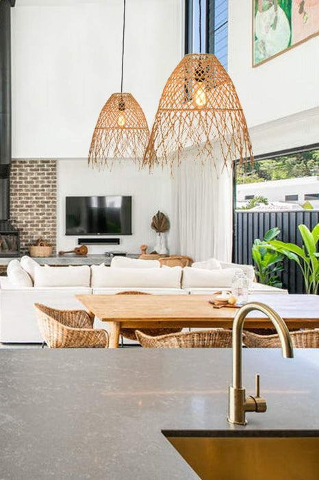 The Monterey Basket Pendant Light blends a clever design filled with texture and warm coastal charm to create an eye-catching piece in any space. The artfully woven handmade rattan shade features a pattern designed to cast fascinating light and shadow. Suspended from a black cord this light brings warm and atmospheric lighting to kitchens, living rooms and bedrooms.