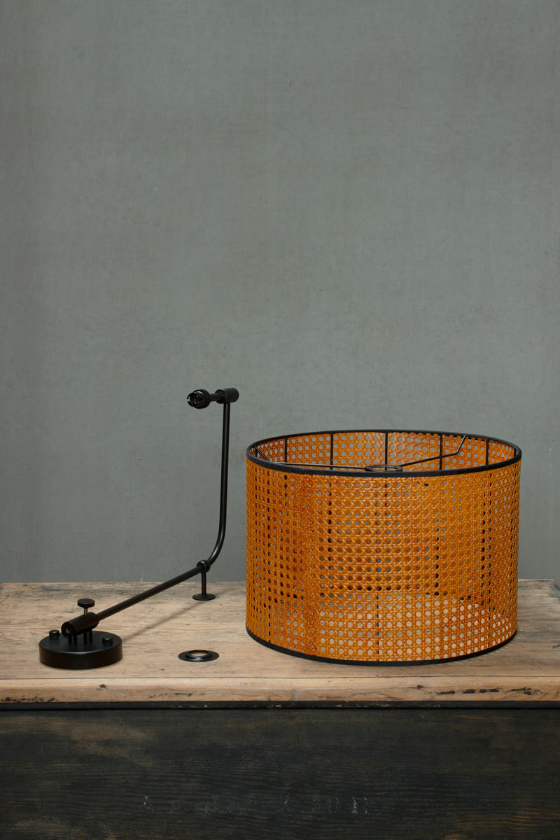- Features a hand made rattan shade that has an internal black metal frame and black fabric trim.