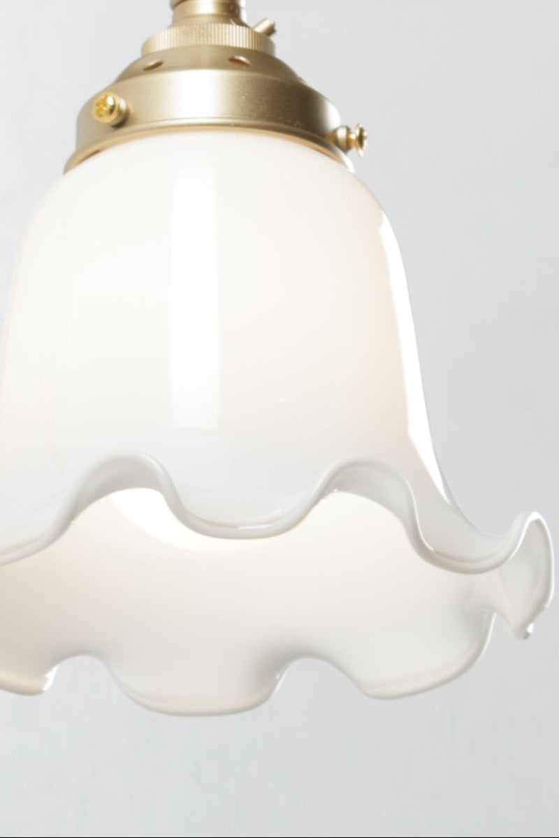 - The opal glass shade boasts a elegant scalloped edging, adding a touch of grace to its surface.