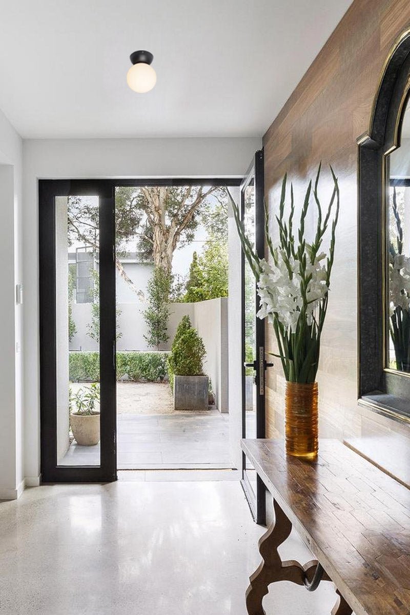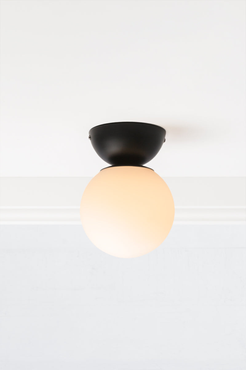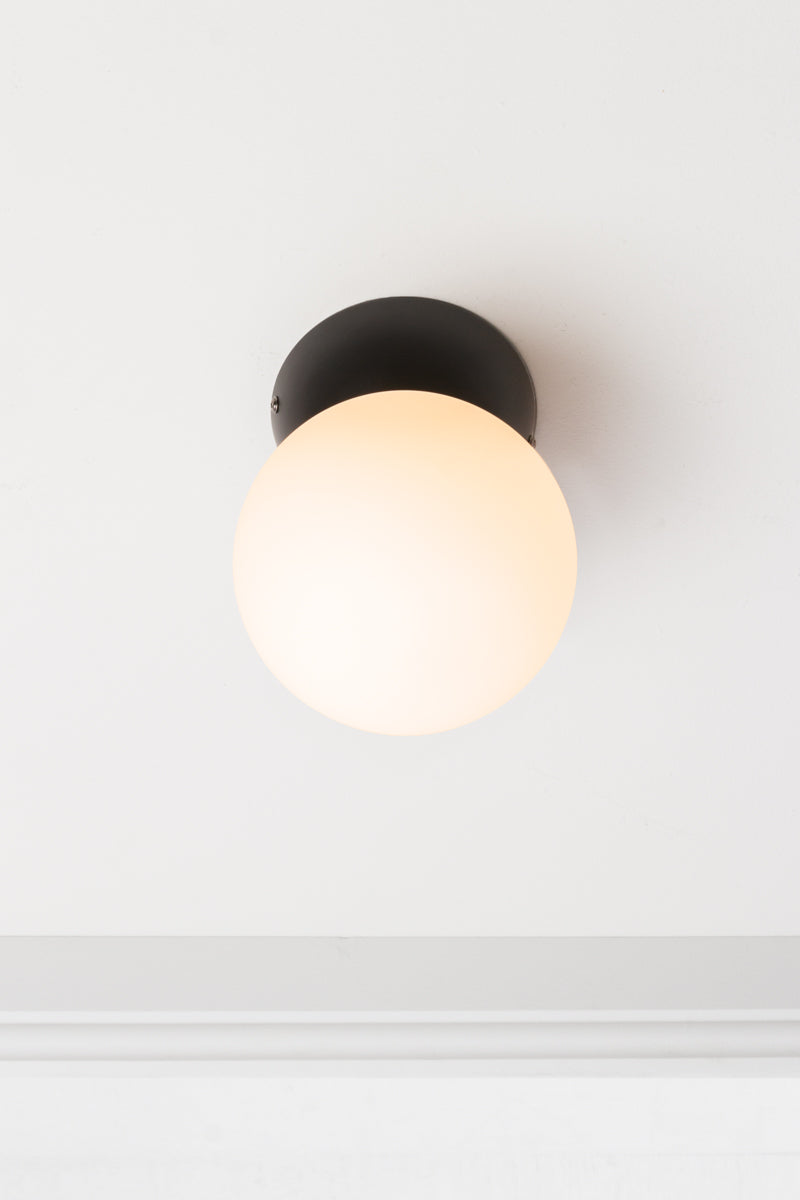 Revitalise your interior space with the Oslo Glass Ceiling Light. Its Nordic-inspired design with black steel ware is paired with an elegant opal glass orb, this light adds a touch of refinement and individuality to your room decor. Suited for those with a contemporary design aesthetic, this light can be mounted close-to-ceiling in multiples for a stylish and luminous atmosphere. Ideal for low-ceiling spaces or for compact areas.