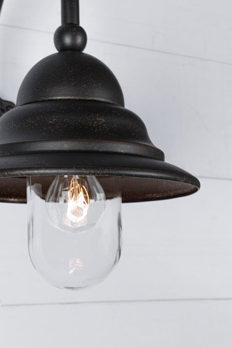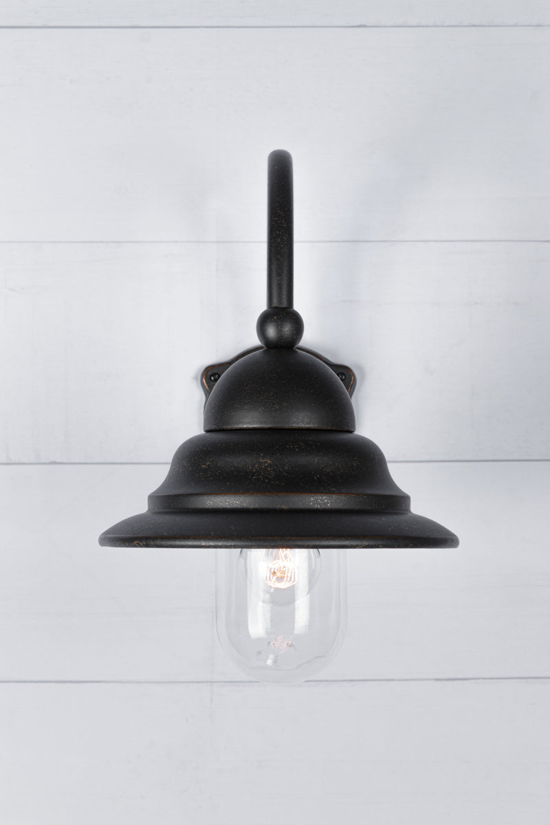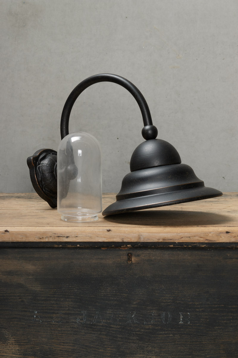 • Constructed from metal, it features a shepherd's hook wall sconce and glass cover.