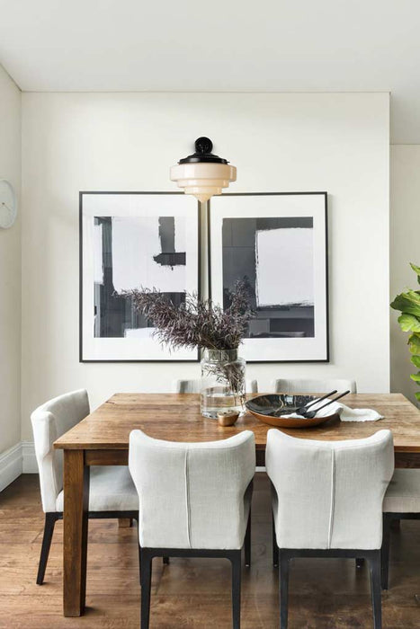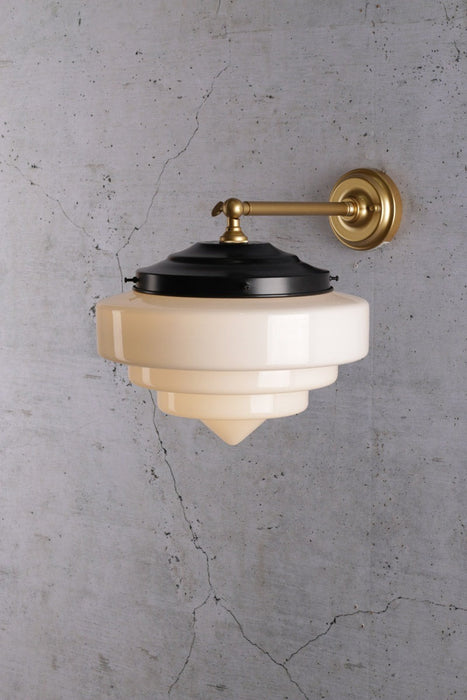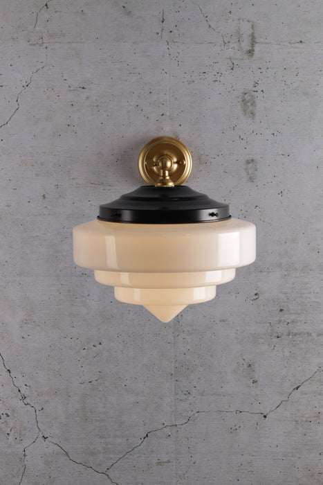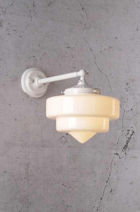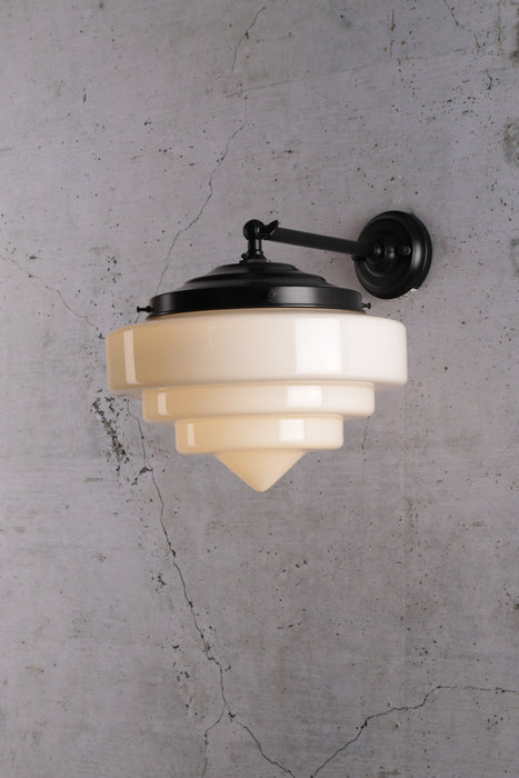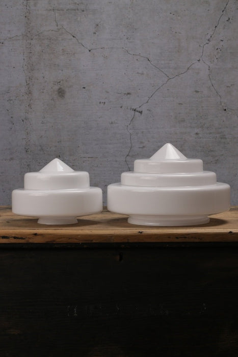- Its deco style opal glass shade diffuses light. Features a tiered level design shaped in the the shade. Two sizes available.
