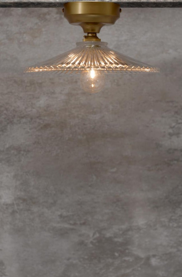The Plymouth Glass Ceiling Light has a classic vintage aesthetic. It features a flared glass shade with ribbed detailing that adds to its refined style. Close to ceiling lights are an ideal option for interiors such as apartments, wine cellars and inns with low ceilings as they take minimal vertical space.
