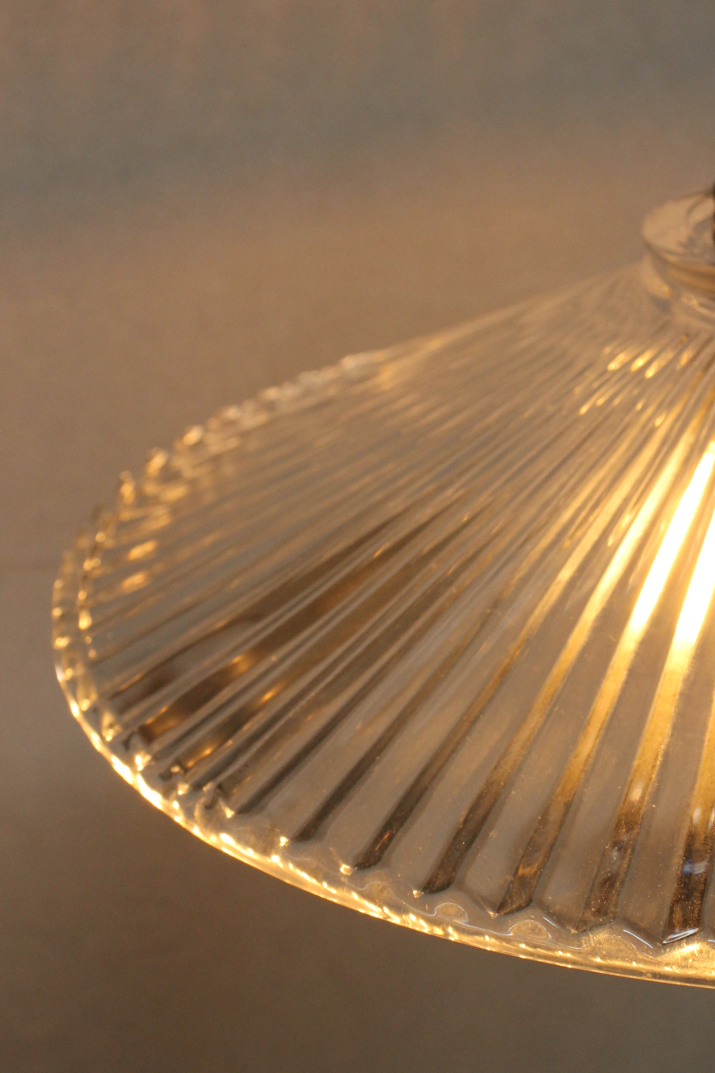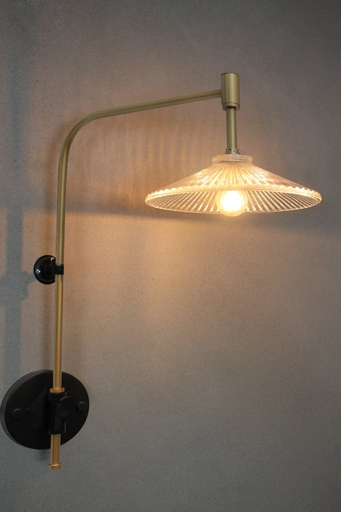 The Plymouth Glass Wall Lamp features a vintage style with a conical glass shade and a gold/brass wing arm wall mount. The thick shallow conical glass shade spreads light and can easily be matched with a variety of bulbs. Perfect for an office, study space, or café/restaurant. .