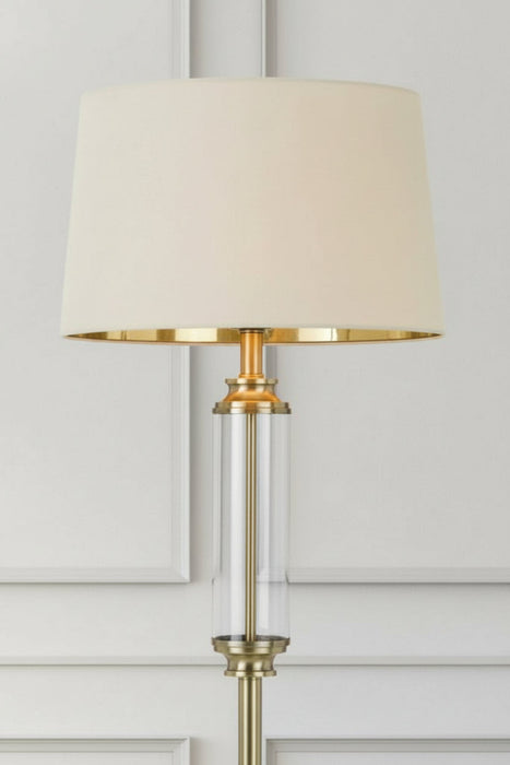 - The antique brass base features a lightly tinted glass cylinder paired with a cream shade and gold inner lining.