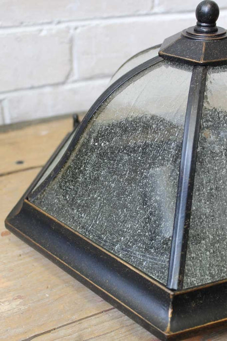 This Regent Outdoor Ceiling Light will bring timeless appeal and add character to any indoor or outdoor space. This flush mount light has antique bronze or antique black metal rib panelling encasing the decoratively aged glass. It is weather resistant and can be used for outdoor and indoor use. It will add regal character to your space, entryway or porch. Suitable for commercial fit-outs too; restaurants, taverns, hotels, bars and beer gardens.