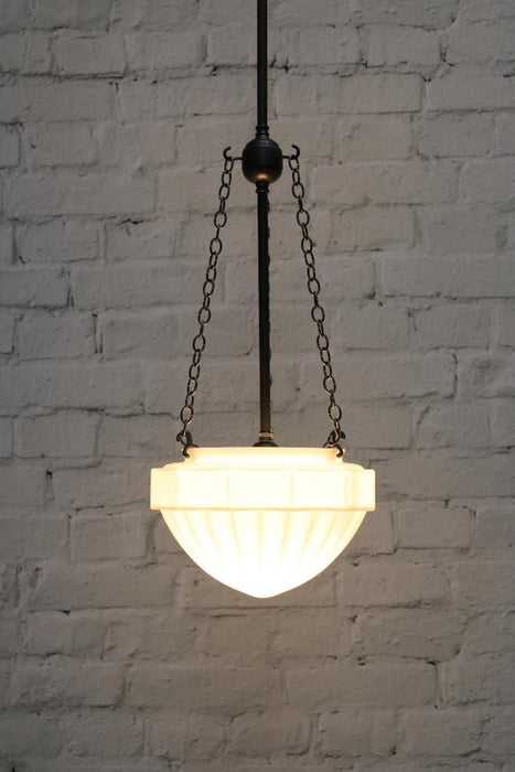The classic and elegant design of the Riviera Chain Rod Pendant Light will add flair to any space. Constructed with quality handcrafted brass, the chain suspension is built for both style and sturdiness. The glass shade features a vintage ribbed design and a gloss opal finish. Style this in dining rooms, living rooms or hallways.