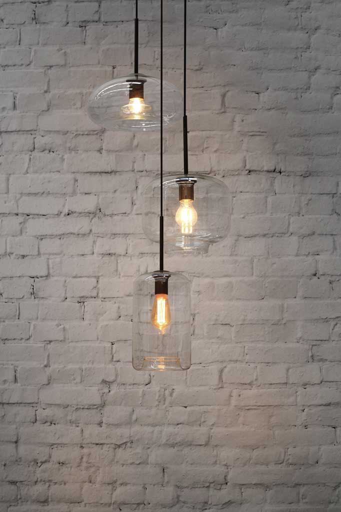 - The three-light pendant includes one square, one cylinder and one oval shade.