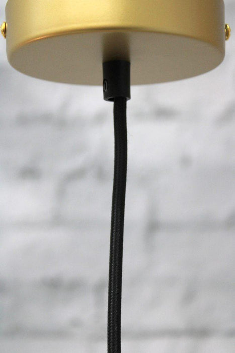 - The shade is suspended from braided black cloth cord with metalware in black or gold/brass finish.