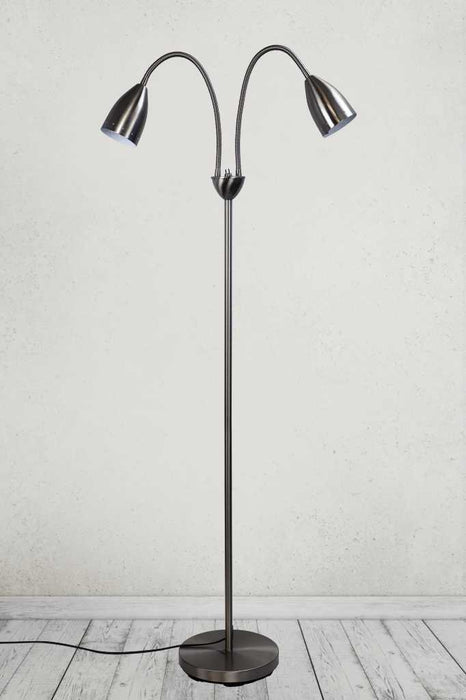 - Two flexible gooseneck arms with metal shades.