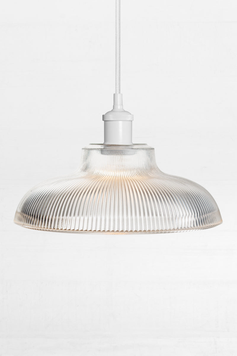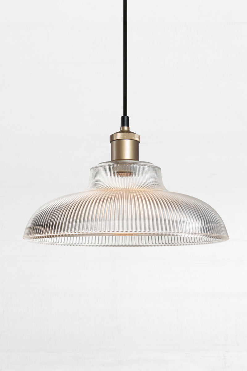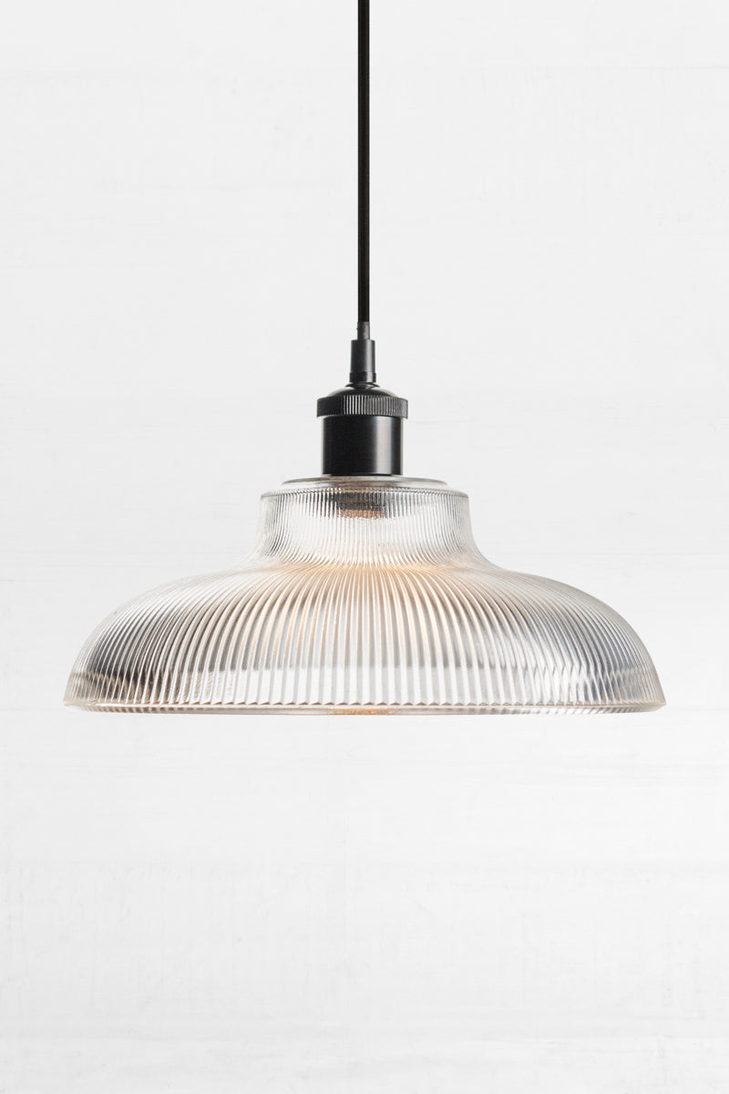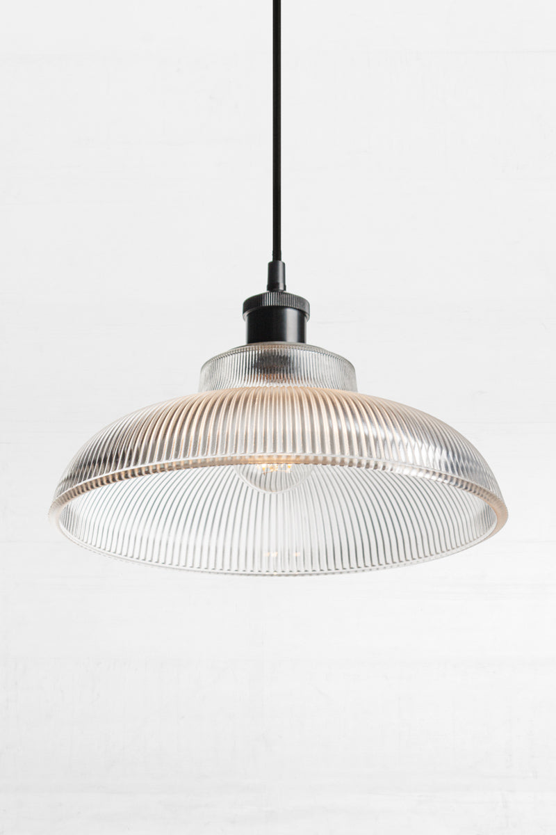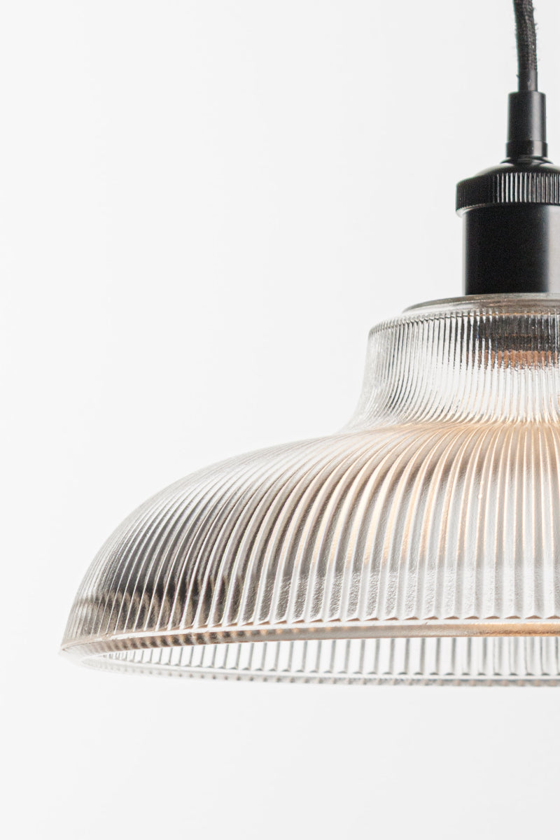 Enhance your modern living spaces with our Sur Glass Pendant Light. The holophane glass shade has a distinctive texture to diffuses light evenly throughout a room. Tailor the shade with a variety of suspension cord choices. Perfect for hallway lighting, hung in multiples over a dining table or kitchen island, as well as bars and commercial locations wanting to add some classic style.