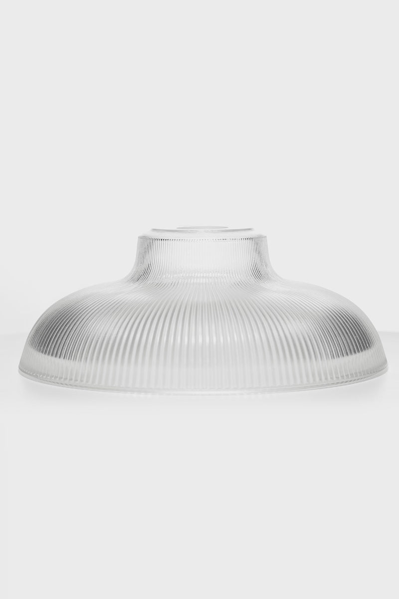 The Sur Glass Shade boasts a curved glass shade with a classic design and a unique texture. With its holophane style ribbed design, this shade evenly diffuses light and adds timeless charm to any space.