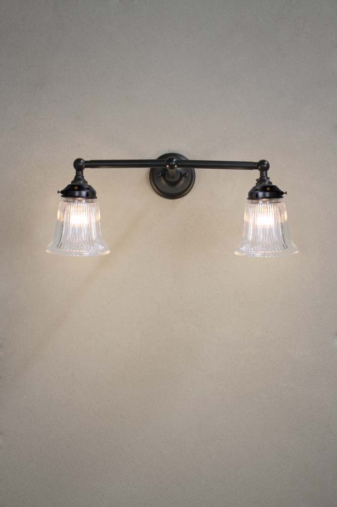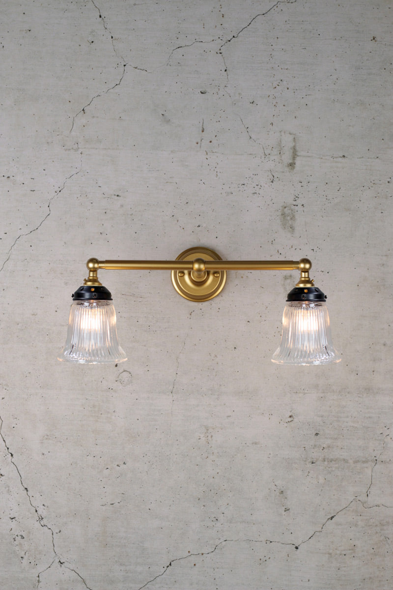 Evoking the iconic style of the early 1900s, the Victoria Double Swivel Arm Wall Light brings vintage charm with a modern touch to your living spaces. Its classic holophane glass shades complete with subtle curves and ribbed surface come in clear or opal finish to offer two distinct lighting statements. Mounted to a steel double arm sconce in a choice of three varying finishes to complement your décor, it features swivel lampholders. Its glass shades make an ornate feature for your café and restaurant interiors, living rooms and dining rooms.