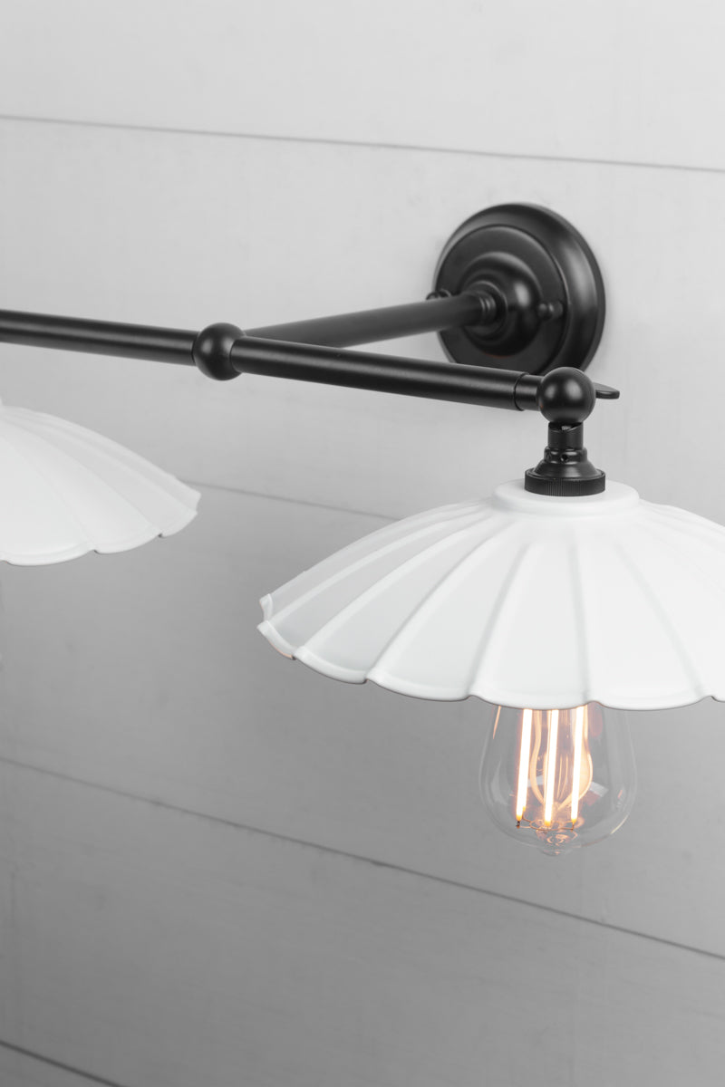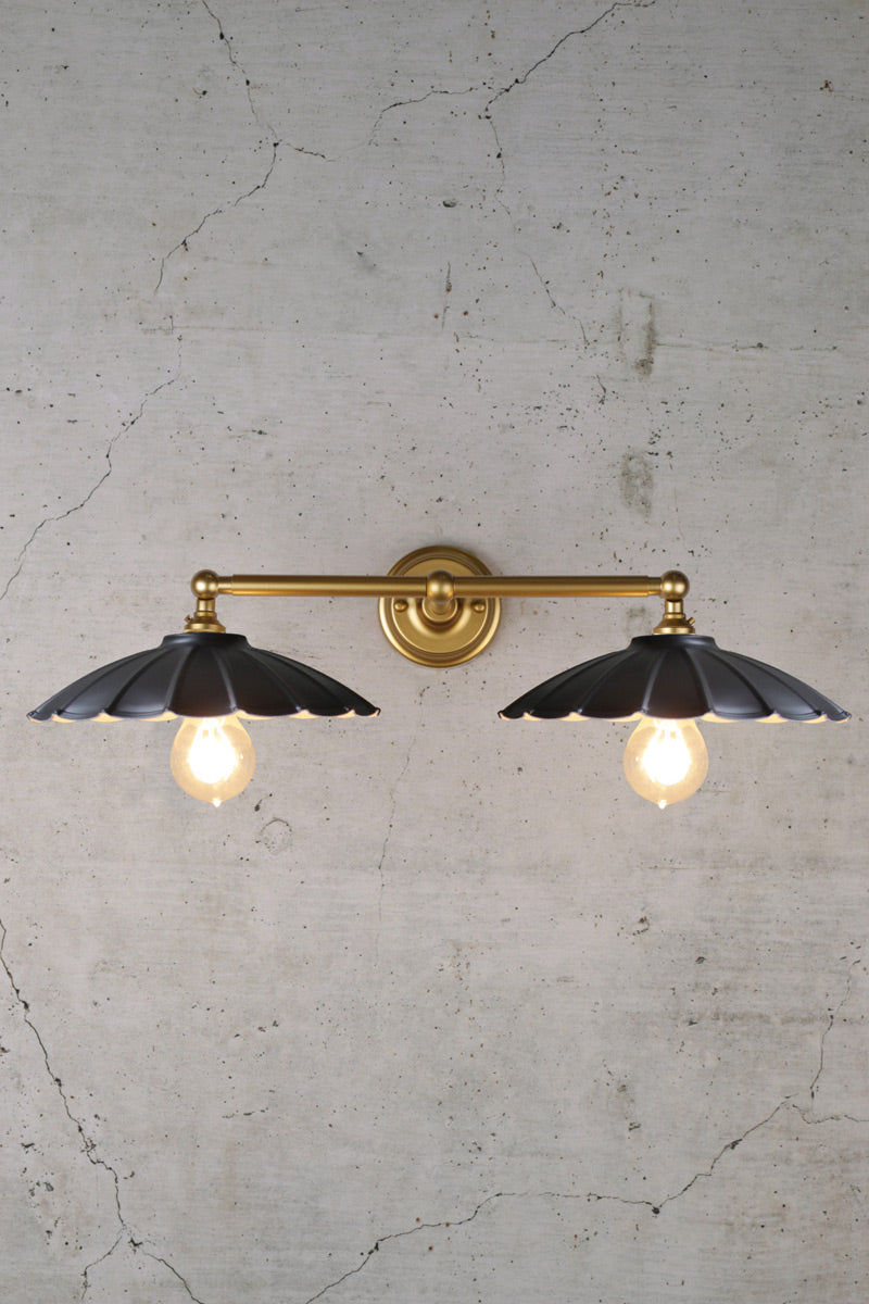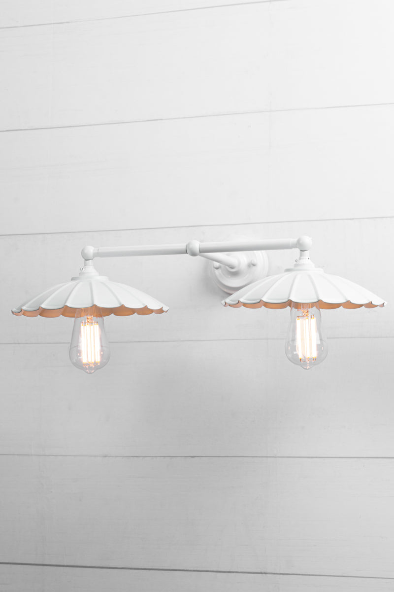 The Vintage Umbrella Double Swivel Arm Wall Light brings authentic flair with a soft industrial edge to your living spaces. The wall light features two dainty steel shades with a ribbed surface in matt black, white or rusty finish to complement your decor. The shades are paired with a double arm steel sconce in a choice of three finishes and has the added benefit of swivel lampholders to direct light as needed. Either as a single accent or a series, the wall light makes a perfect styling option for cafe interiors, bathroom vanities or hallways.