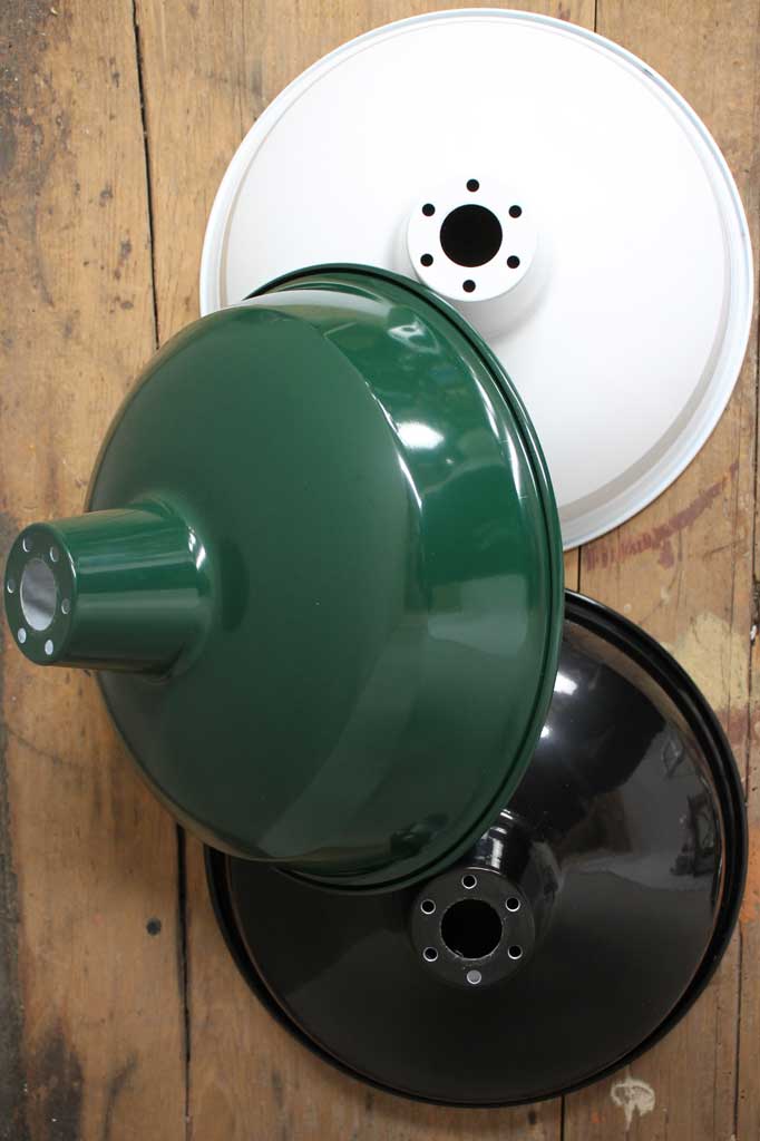 - The large size shade is 220mm high and 420mm in diameter across the bottom. Colours available in the steel shades are black, white or federation green with a white powder coated inner. There is also an aged solid copper shade.