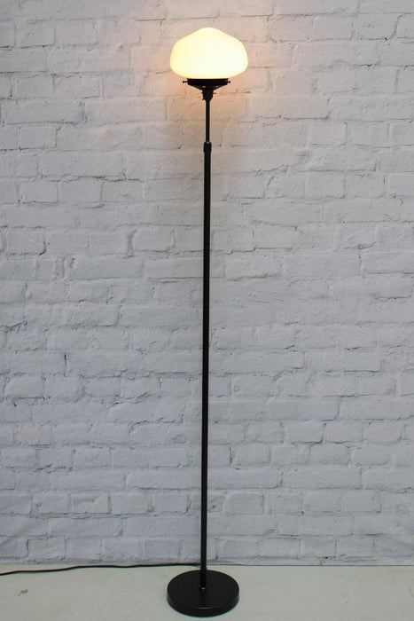 - The classic schoolhouse opal glass shade produces a diffused lighting feature.