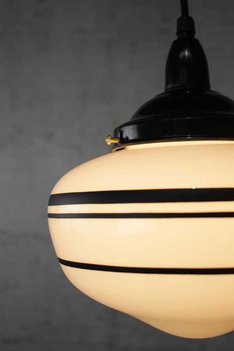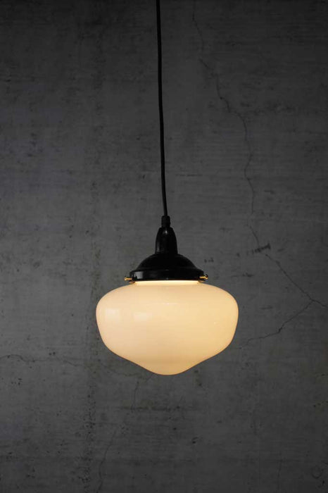 - It features a schoolhouse style handblown opal glass shade. Bubbles, lines, slight surface imperfections or discolouration are characteristics of handblown glass. They are not defects.