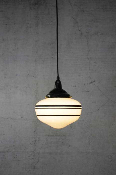 Bring the charm of nostalgia to your outdoor living spaces with the Washington Outdoor Pendant Light. Its handblown opal glass shade derived from the schoolhouse shades of yesteryear, comes in two sizes with the small shade available plain or accented with hand painted stripes for added flair. Paired with a black IP rated suspension cord this pendant light offers timeless appeal and character for your bathroom, front porch, under cover courtyard or patio.