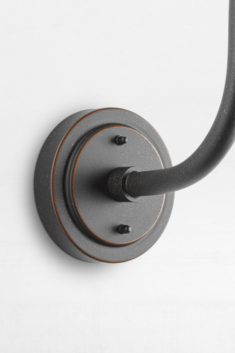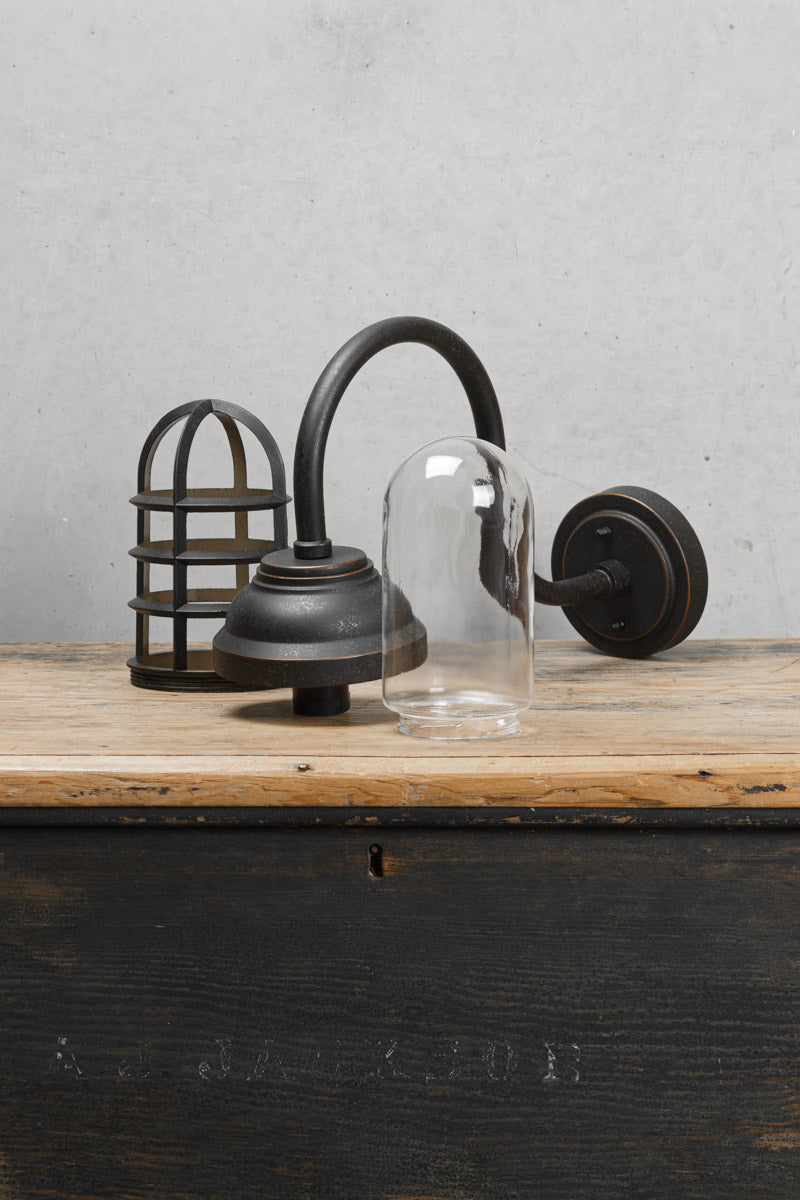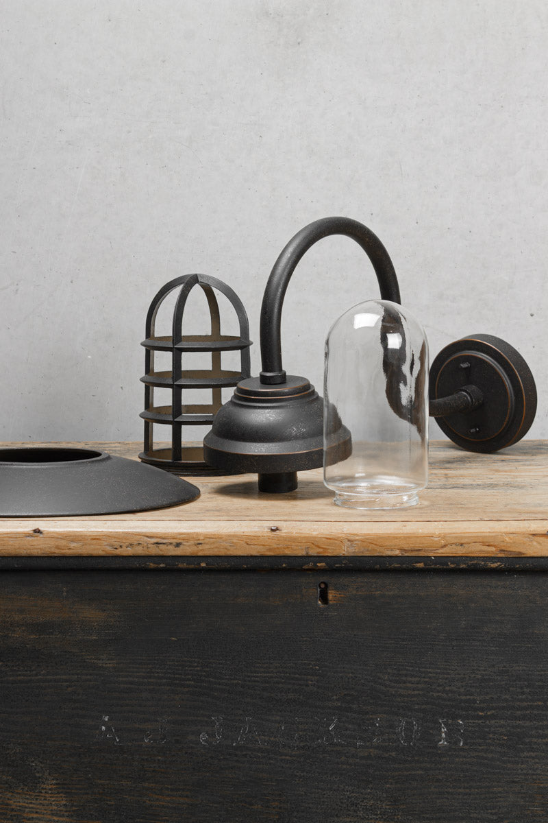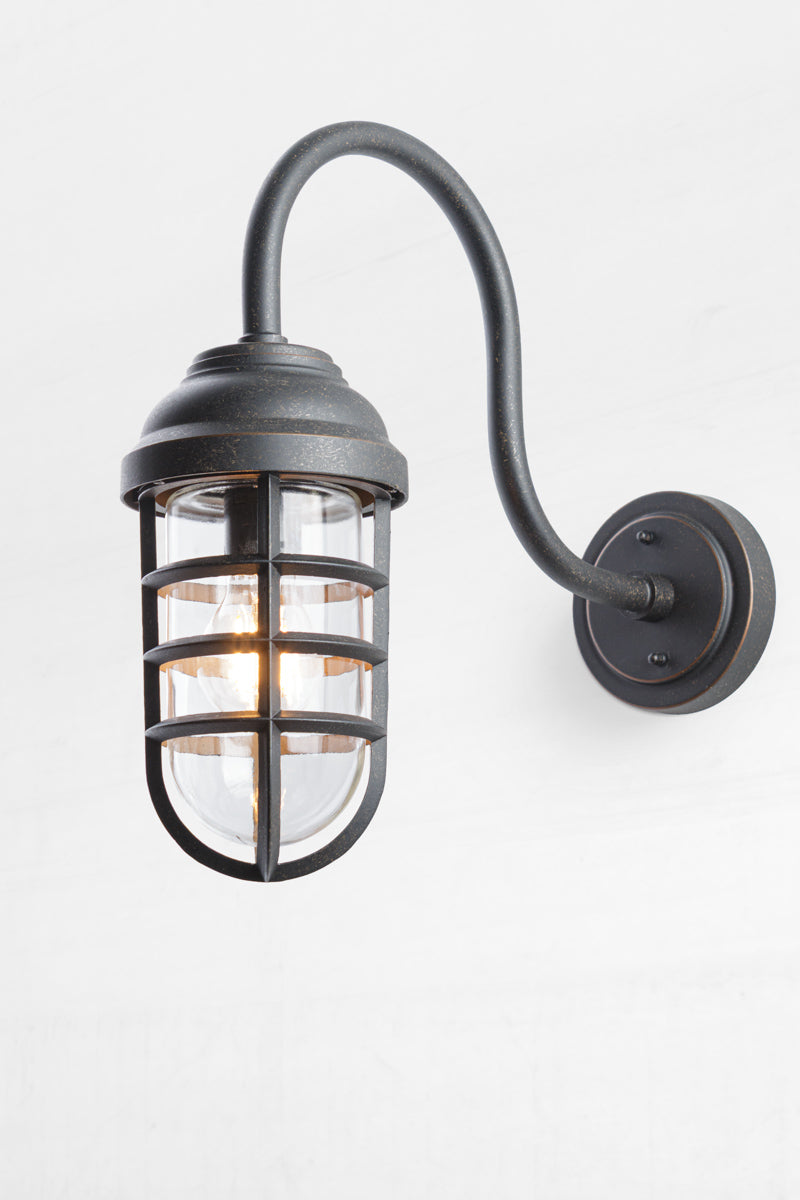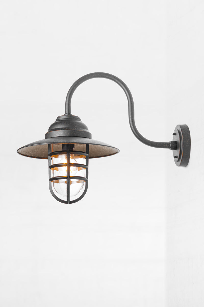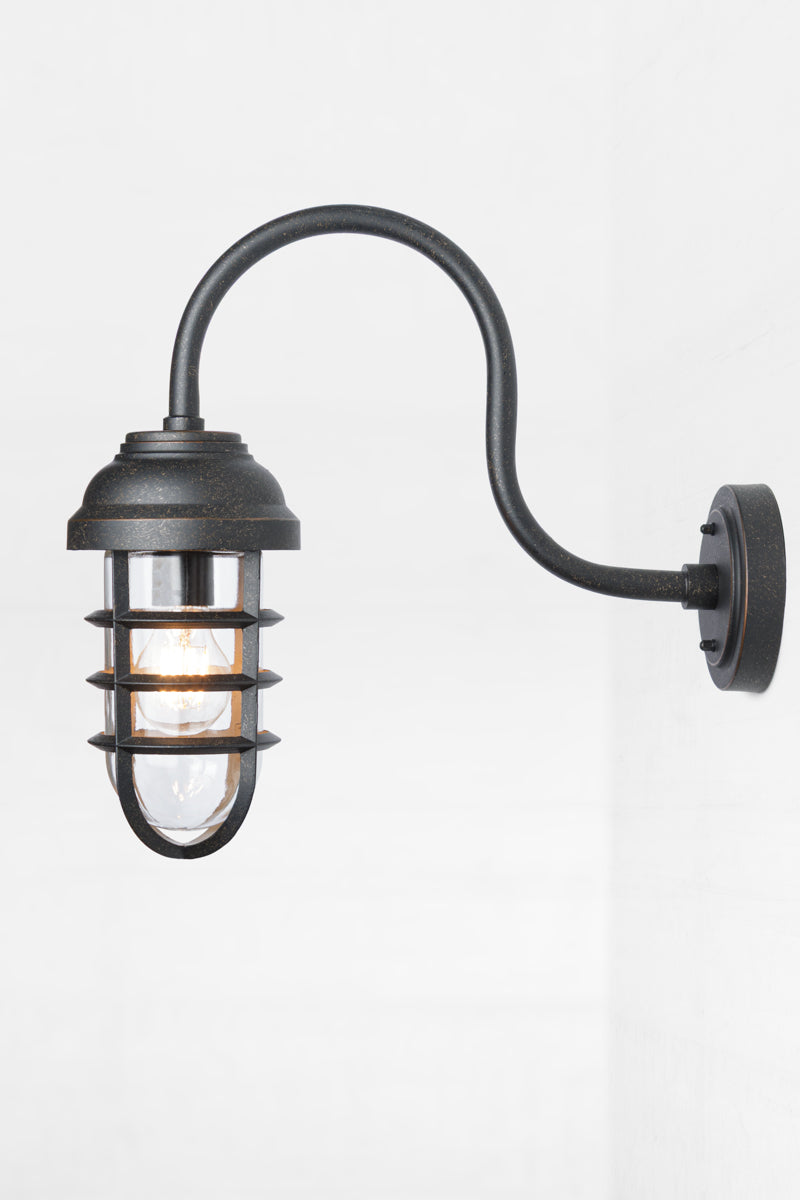 - Gooseneck sconce and cage housing is constructed from steel with an optional aluminium shade.